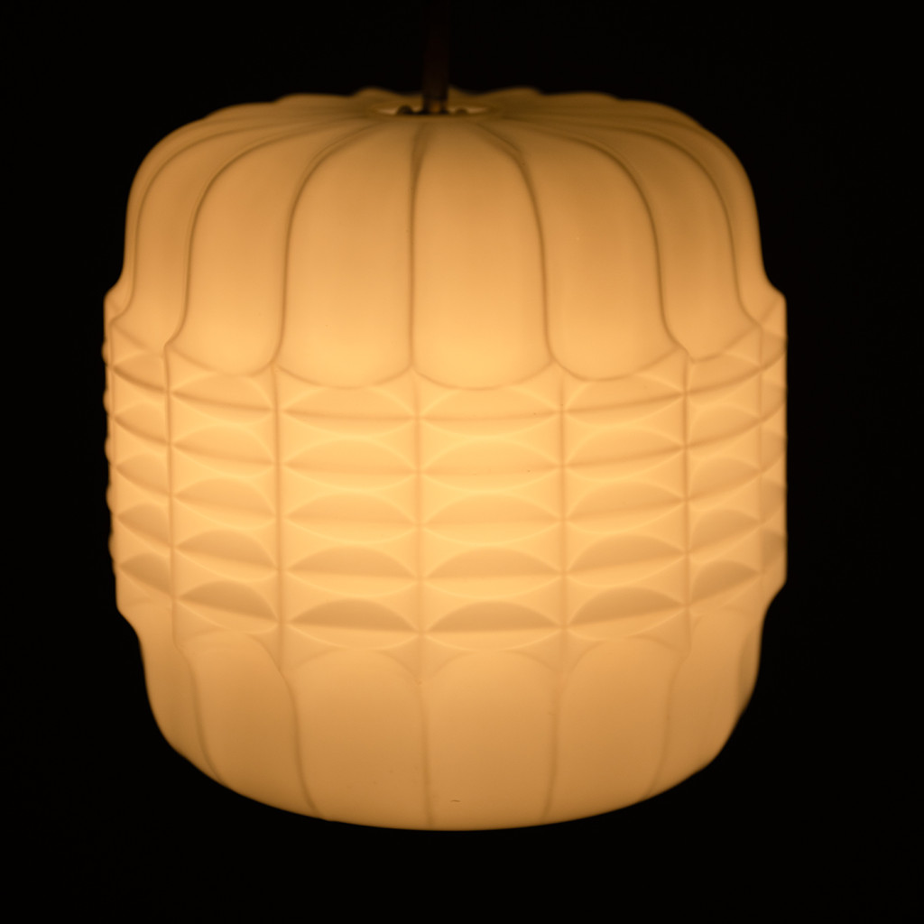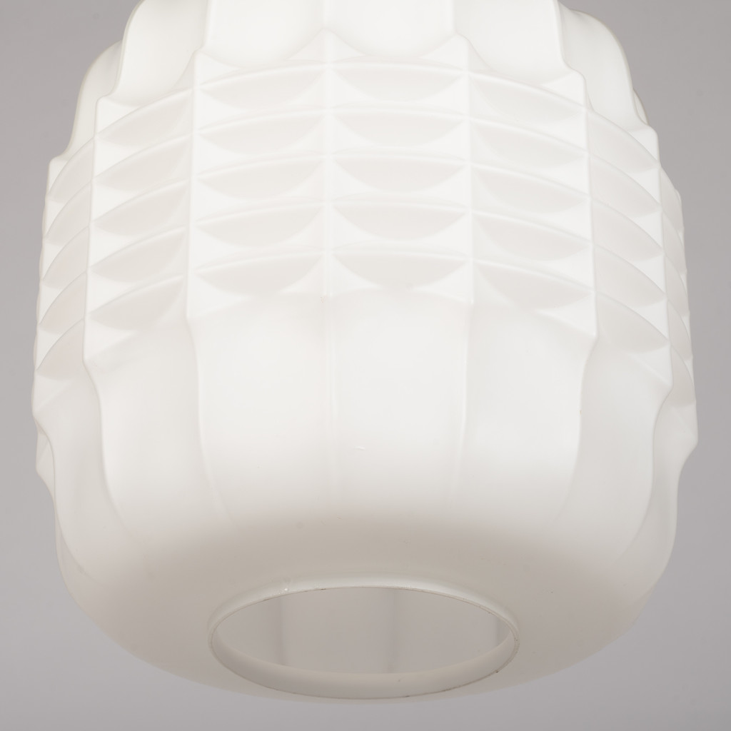 Skleněný lustr vyrobený v 70. letech národním podnikem Osvětlovací sklo ve Valašském Meziříčí. Sklárna ve Valašském Meziříčí byla dříve hlavní sklárnou společnosti S. Reich & Co, největšího výrobce osvětlovacího skla v Rakousku-Uhersku. Lampionovité stínidlo je vyrobeno z bílé matované, vrstvené triplex opálové skloviny - materiálu, který díky trojímu lomu vytváří příjemné, rozptýlené světlo. Světlo má mosaznou závěsnou tyč a je zcela funkční ve skvělém původním stavu, pouze tyč má přirozenou patinu. Svítí na jednu žárovku se závitem E27.