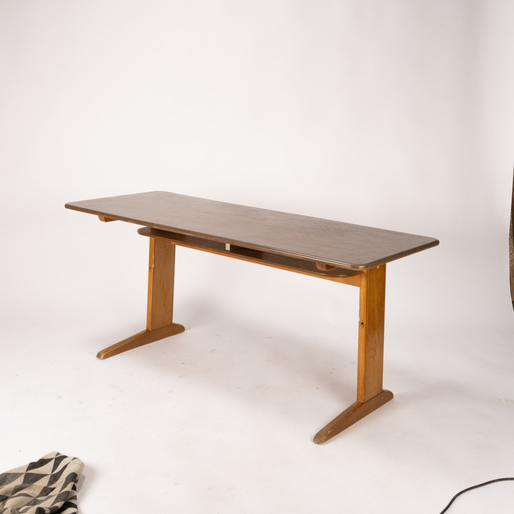 Dřevěná školní lavice z bukového masivu, lakovaná a mořená do medového odstínu. Pod pracovní deskou krytou hnědým laminem je úložný prostor určený pro sešity a různé drobnosti. Na boční straně jedné z nohou je nalepené žluté kolečko.