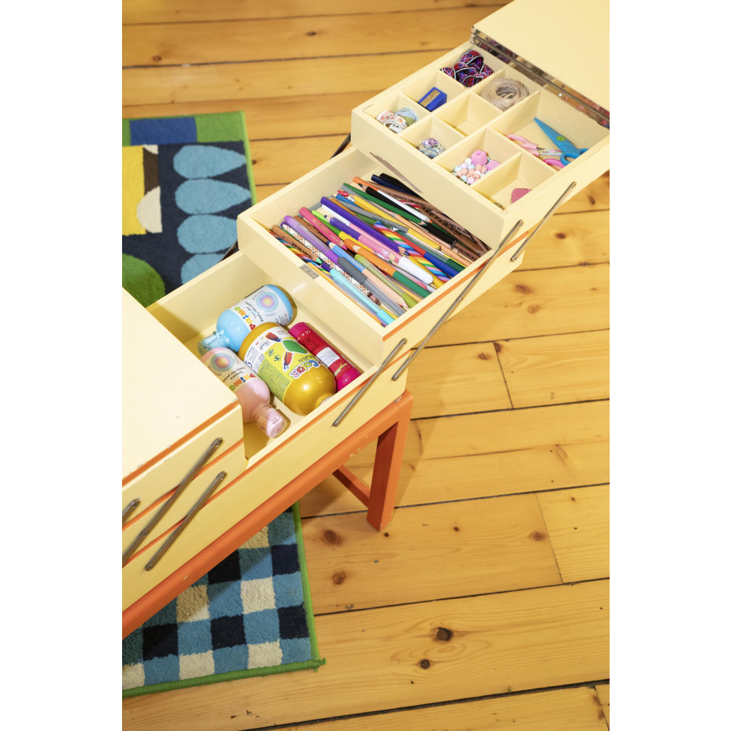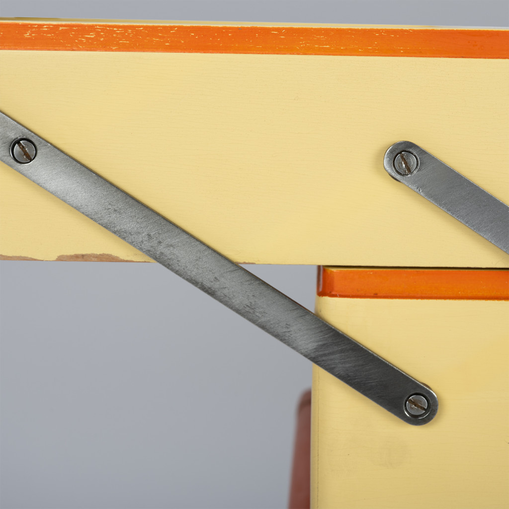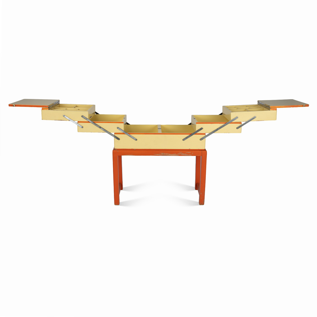 Původní art deco skříňka na šicí potřeby s klasickým postranním vyklápěcím mechanismem nabízí tři úrovně úložných přihrádek. Skříňka je vyrobena z kombinace bukového masivu a překližky a stojí na pevné ocelové konstrukci se sytě oranžovým emailovým nátěrem. Tělo skříňky zdobí email vanilkové barvy s oranžovým lemováním a kovové panty.