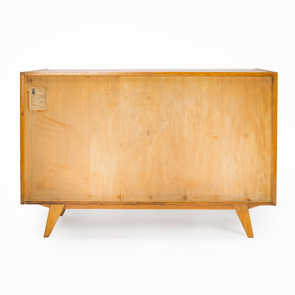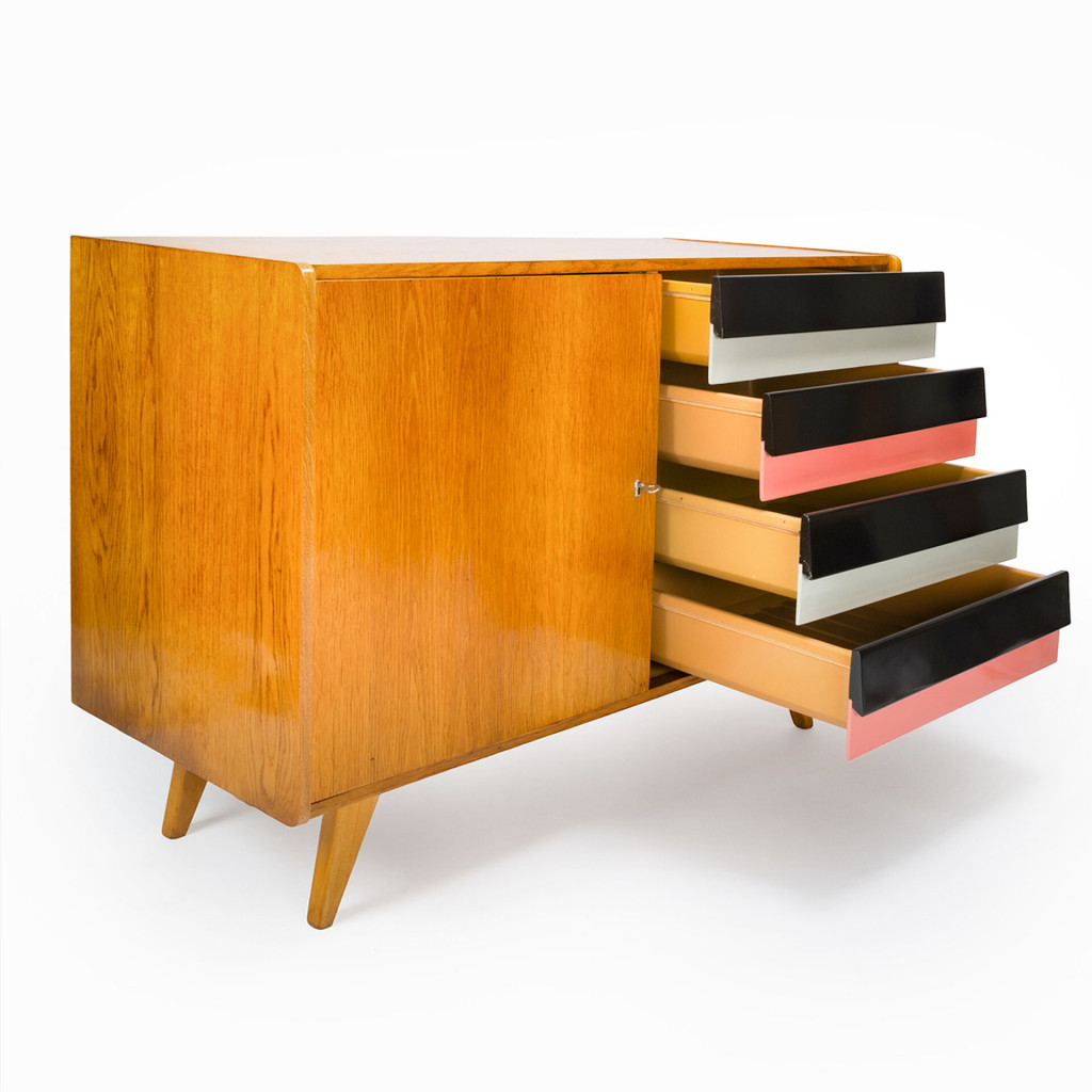 Skříňka pocházející ze slavné série Universal (U-450), kterou navrhl v roce 1958 pro československý národní podnik Interiér Praha designér Jiří Jiroutek.