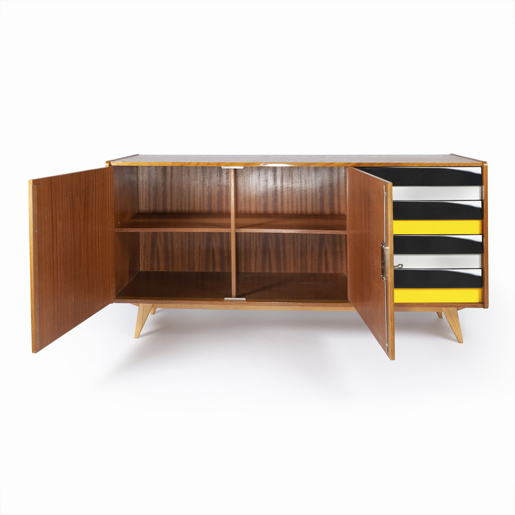 Skříňka pocházející ze slavné série Universal (U-450), kterou navrhl v roce 1958 pro československý národní podnik Interiér Praha designér Jiří Jiroutek.