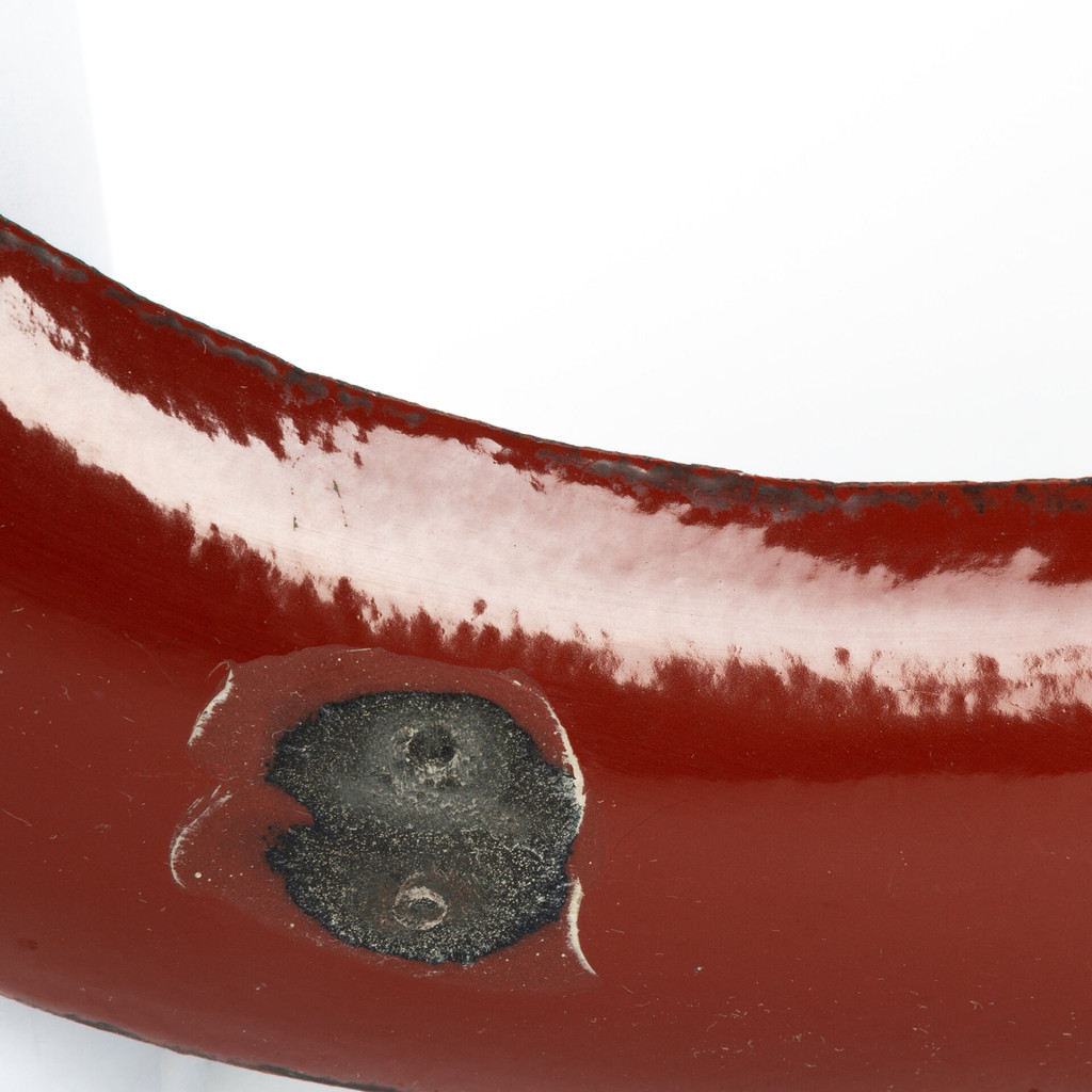 Smaltované písmeno z původní vývěsky. Je natřeno tmavě červenou barvou, která je na některých místech poškozena. Původní uchycení z druhé strany je poškozené.