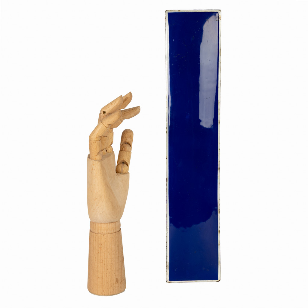 Smaltované písmeno z původní vývěsky jednoduchého fontu. Přední strana písmene je jemně vyboulená, takže působí plasticky a je opatřena tmavě modrým nátěrem s bílou konturou. Písmeno je ponecháno v původním stavu, s autentickou patinou. Barva je na některých místech poškozena. Původní uchycení z druhé strany je poškozené.