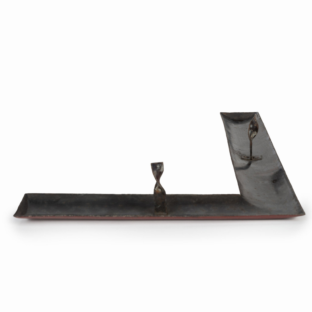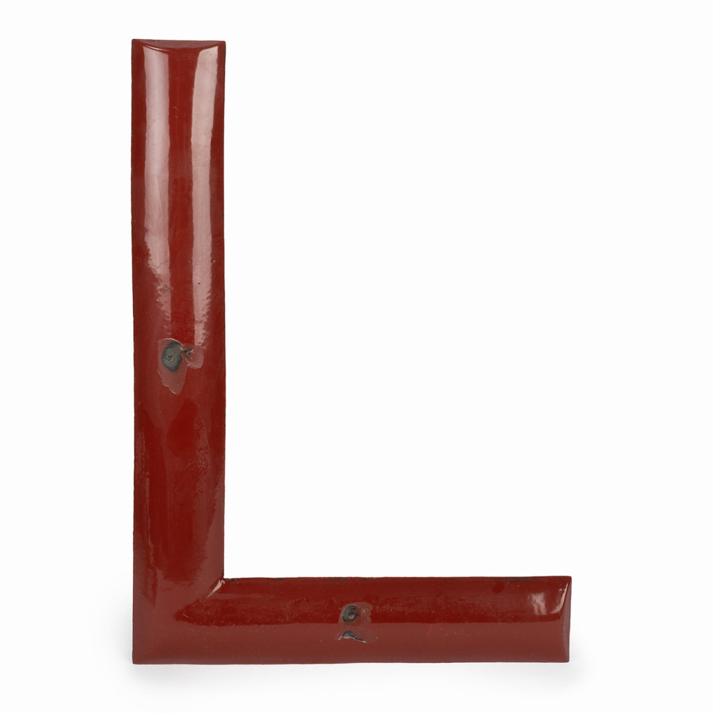Smaltované písmeno z původní vývěsky. Je natřeno tmavě červenou barvou, která je na některých místech poškozena. Původní uchycení z druhé strany je poškozené.