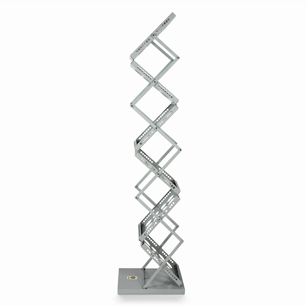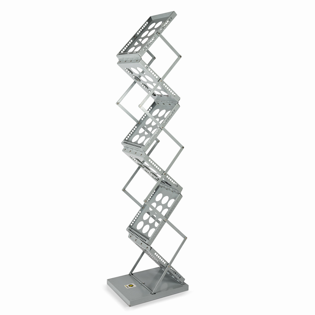Stojan v cik-cak designu nabízí tři úrovně a dohromady šest přihrádek k uložení novin a časopisů formátu A4 z obou stran. Kovové plošky perforované kulatými otvory jsou spojené kovovými příčkami a v kloubech upevněny nýty. Díky harmonikové konstrukci je možné stojan složit do úsporného obdélníkového tvaru.