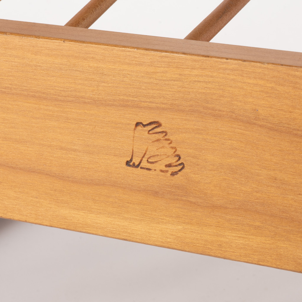 Dřevěný stojan vyrobený v 60. letech podnikem ÚLUV. Ústředí lidové a umělecké výroby vzniklo v roce 1948 sdružením několika značek včetně známé Krásné jizby, která fungovala jako vzorková prodejna a zároveň se v ní pořádaly výstavy a kulturní akce. Zaměřovala se na prodej výrobků lidových a uměleckých řemesel z přírodních materiálů. Dřevěný stojan je vyrobený z bukového dřeva mořeného do sytě hnědého odstínu. Je ve velmi dobrém původním stavu a má pouze lehké oděrky, které jsou vidět na fotografiích.