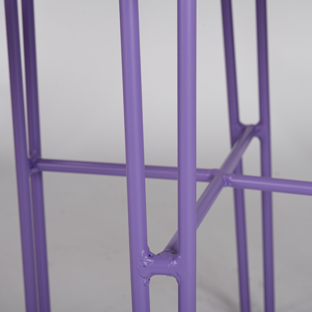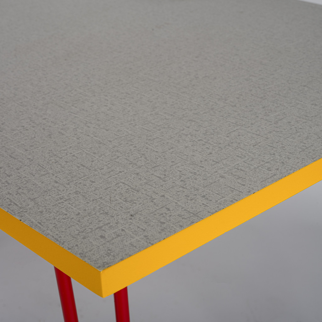 Desky mají lehce asymetrický tvar a jsou vyrobeny z kombinace překližky a umakartu v bílo-šedém odstínu se žlutým lemováním. Leží na vysokých nožkách z ohýbané oceli s křížovou konstrukcí. Nohy stolu jsou natřené červeně, nožky židliček fialově, oranžově, světle modře a světle zeleně.