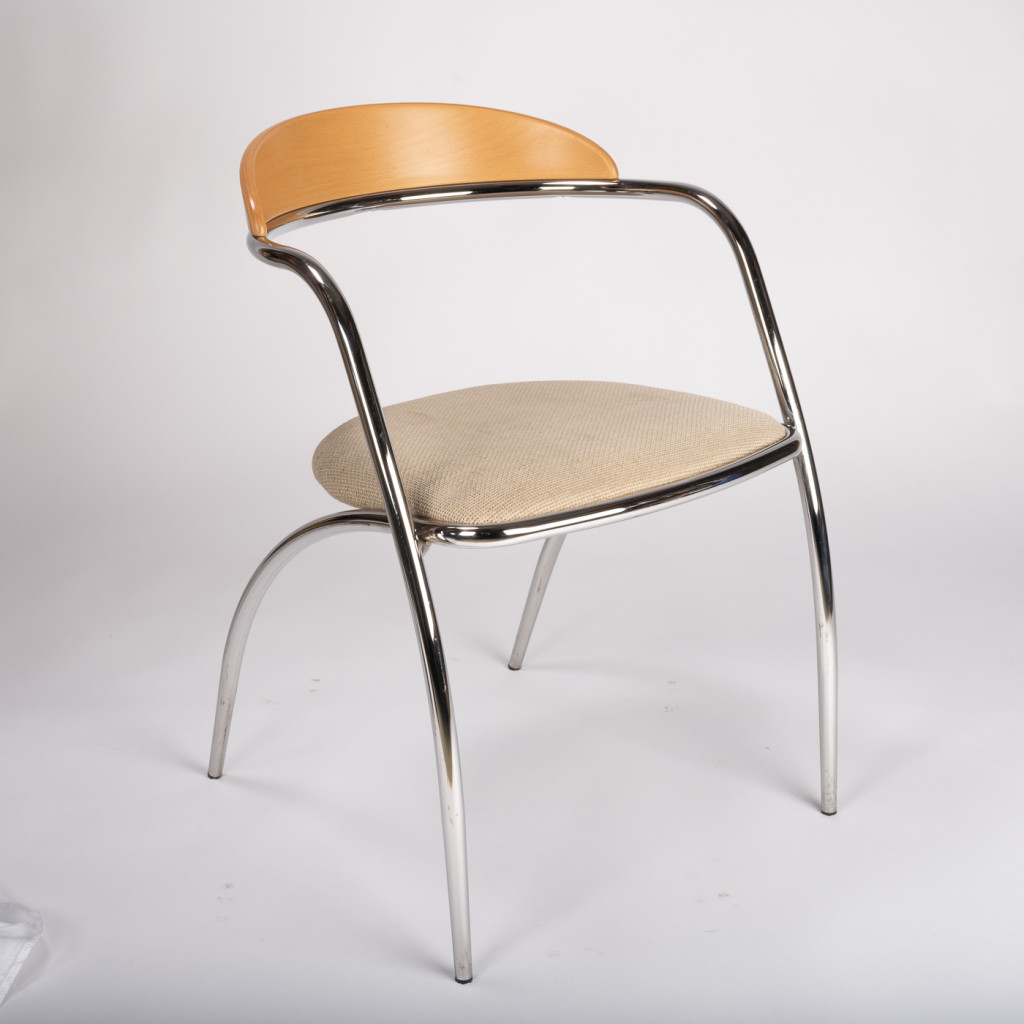 Minimalistická židle vyrobená v 80. letech italskou firmou Effezeta. Židle má prohnutou trubkovou konstrukci z pochromované oceli a úzká dřevěná záda z bukové překližky. Sedák je z měkké béžové látky, ale původní čalounění byla zřejmě černá kůže. Židle jsou stohovatelné a lze je tak úsporně uskladnit.