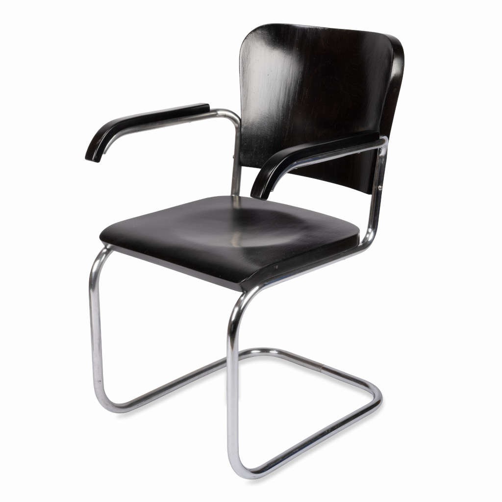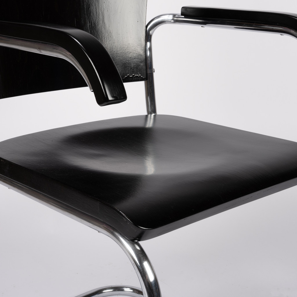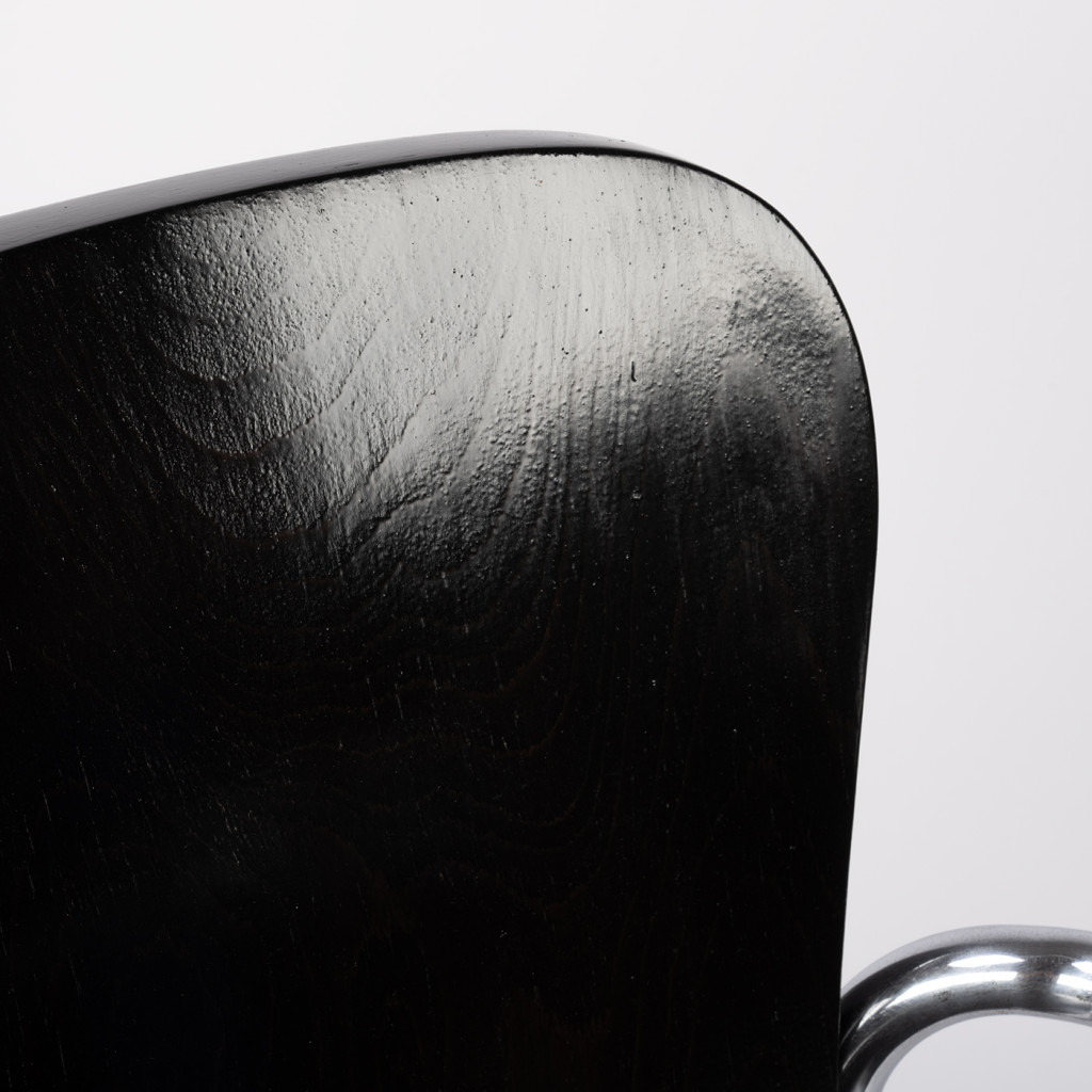 Židle má ohýbanou trubkovou konstrukci z pochromované oceli, která byla důkladně vyčištěna a má pouze drobné oděrky. Dřevěné části jsou vyrobené z kombinace bukového masivu a překližky a mořené do černého odstínu.