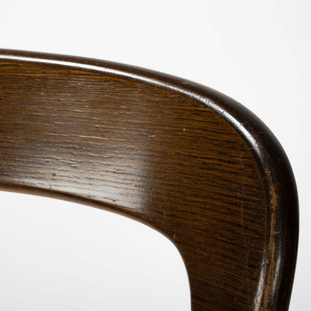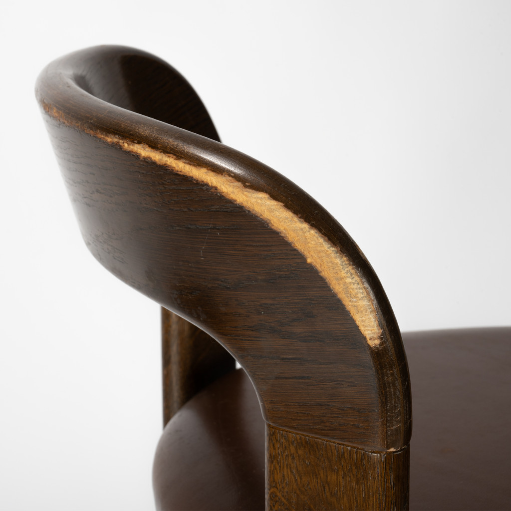 Židle je vyrobena z masivního bukového dřeva mořeného do tmavého odstínu. Sedák je čalounění pravou kůží, která je ve velmi dobrém původním stavu. Dřevěné části a kůže jsou na některých místech odřené. Oděrky jsou viditelné na fotografiích.