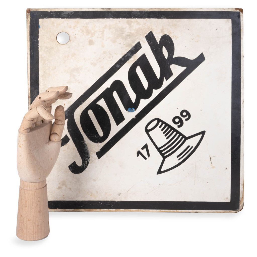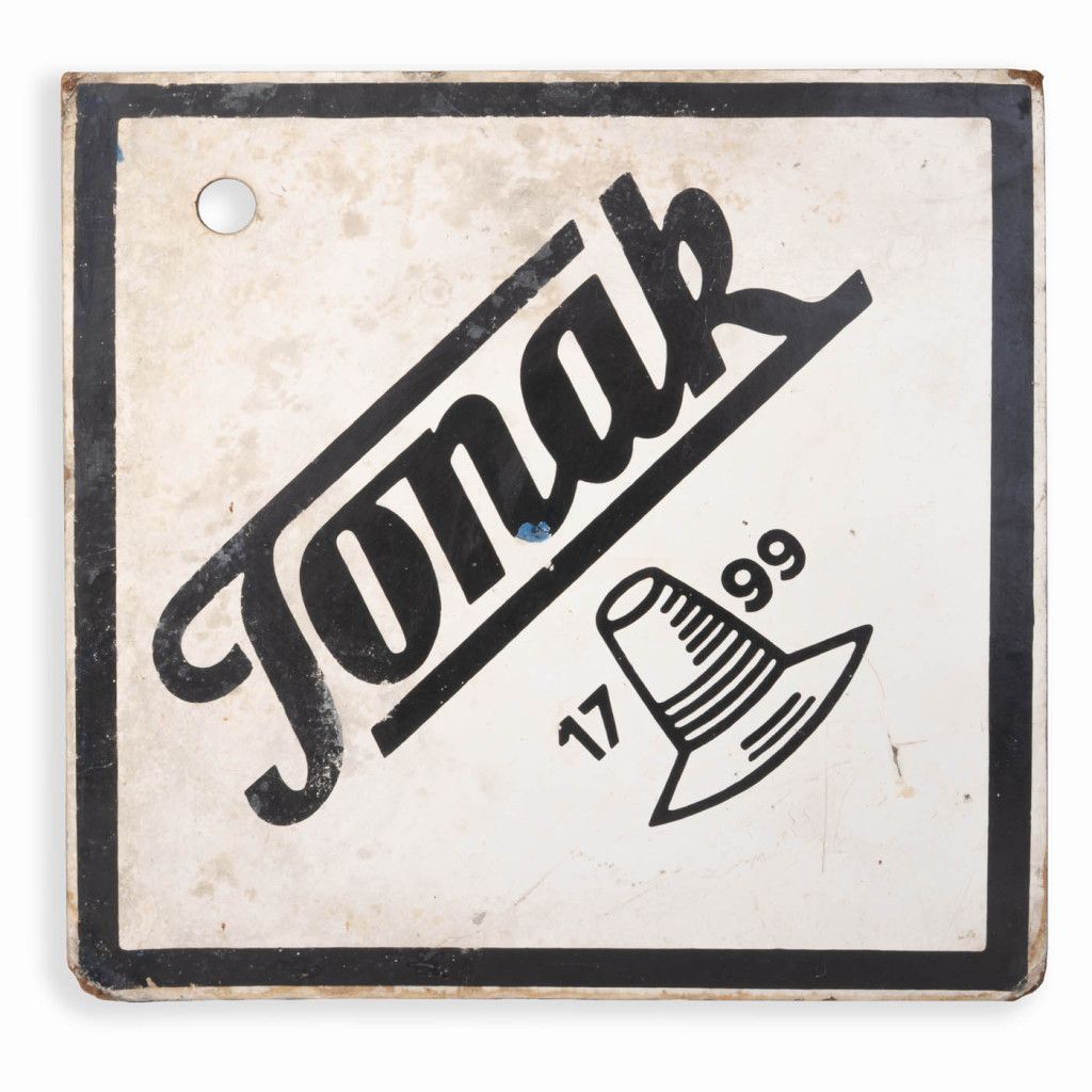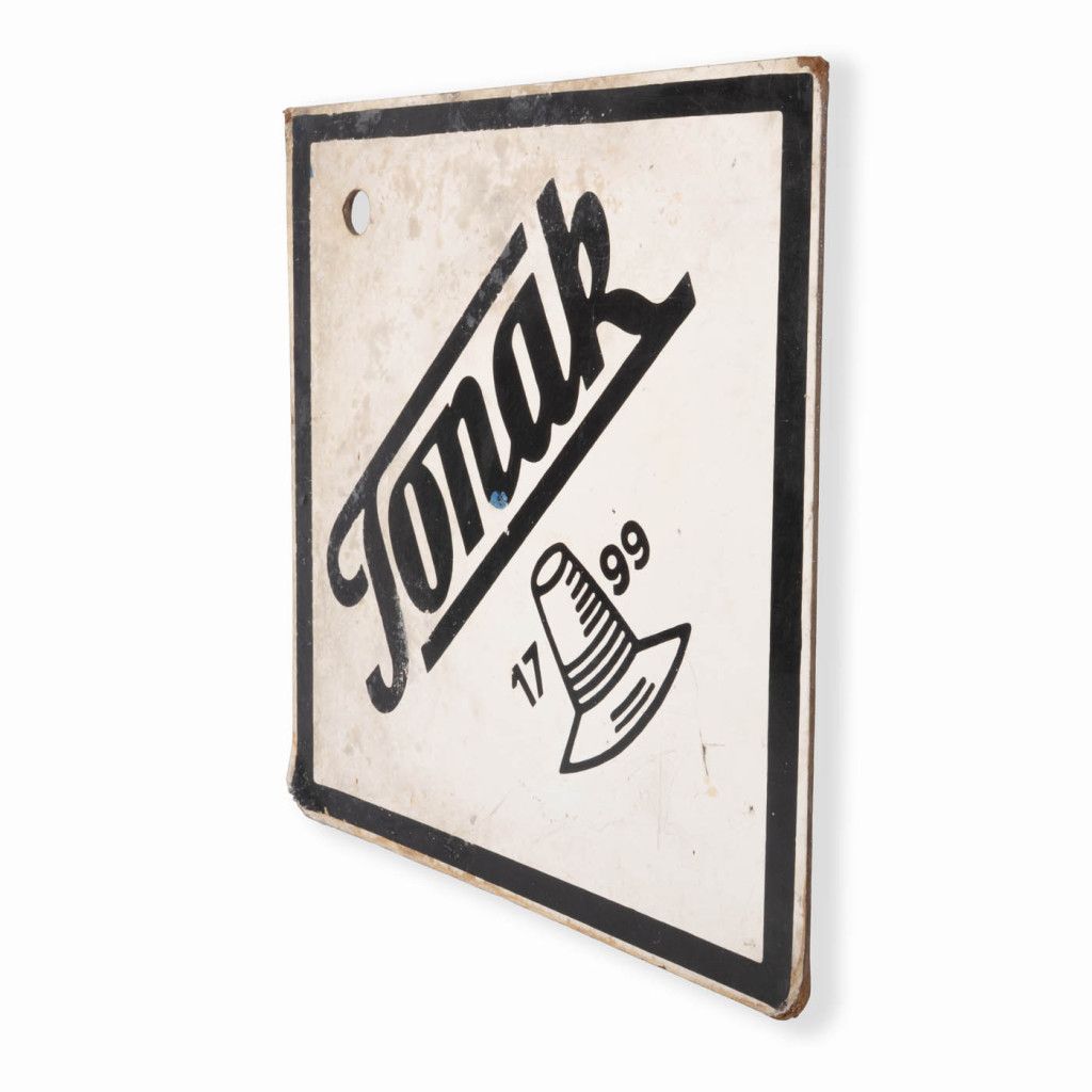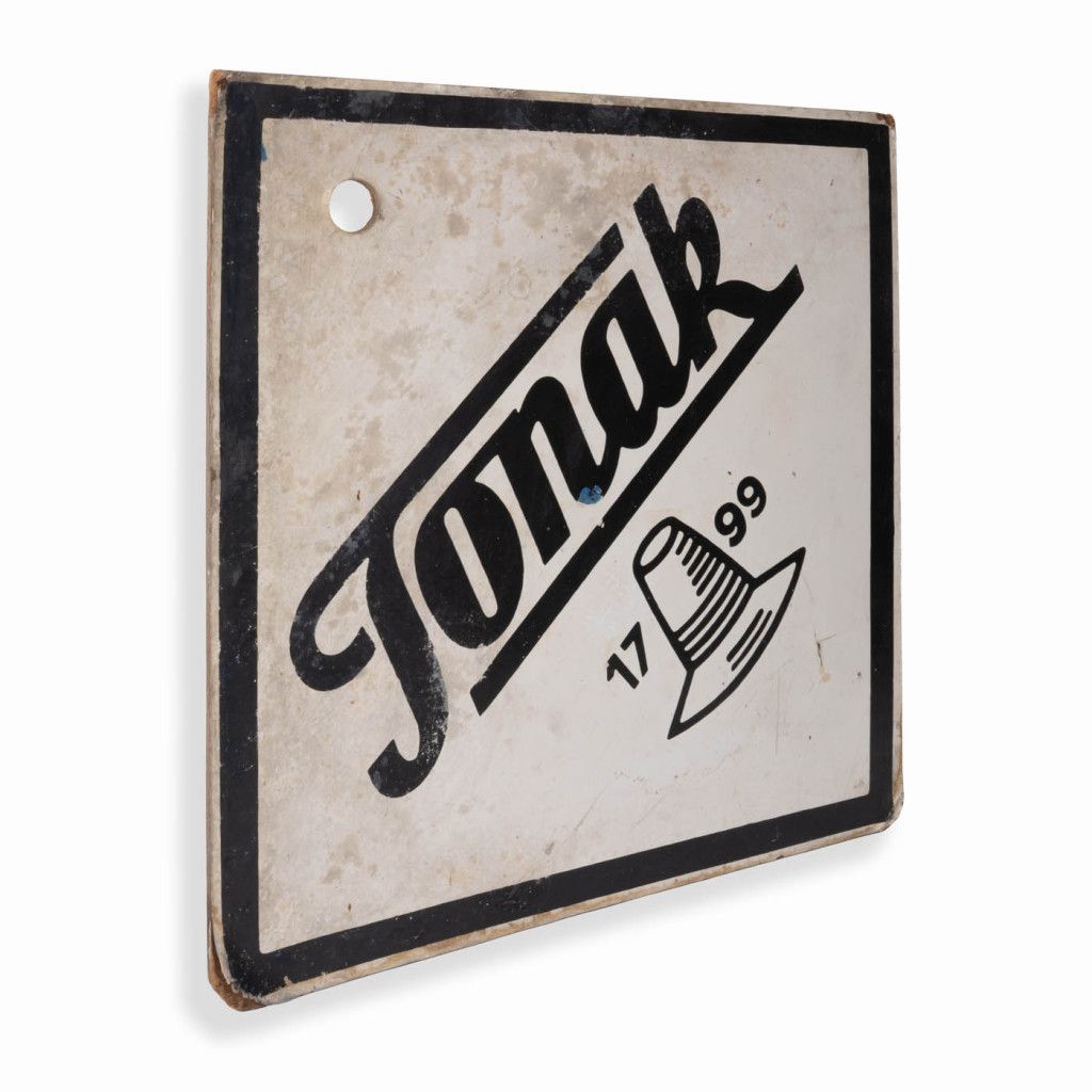 Původní reklamní poutač kloboučnické firmy Tonak z 60. let. Název je odvozen od zkratky slov TOvárna NA Klobouky. Historie značky sahá až do roku 1799 a dodnes patří mezi světovou špičku svého oboru. Poutač je vyrobený z MFD desky polepené papírem a má otvor na zavěšení. Je v dobrém původním stavu s výraznou patinou, která je vidět na fotografiích.