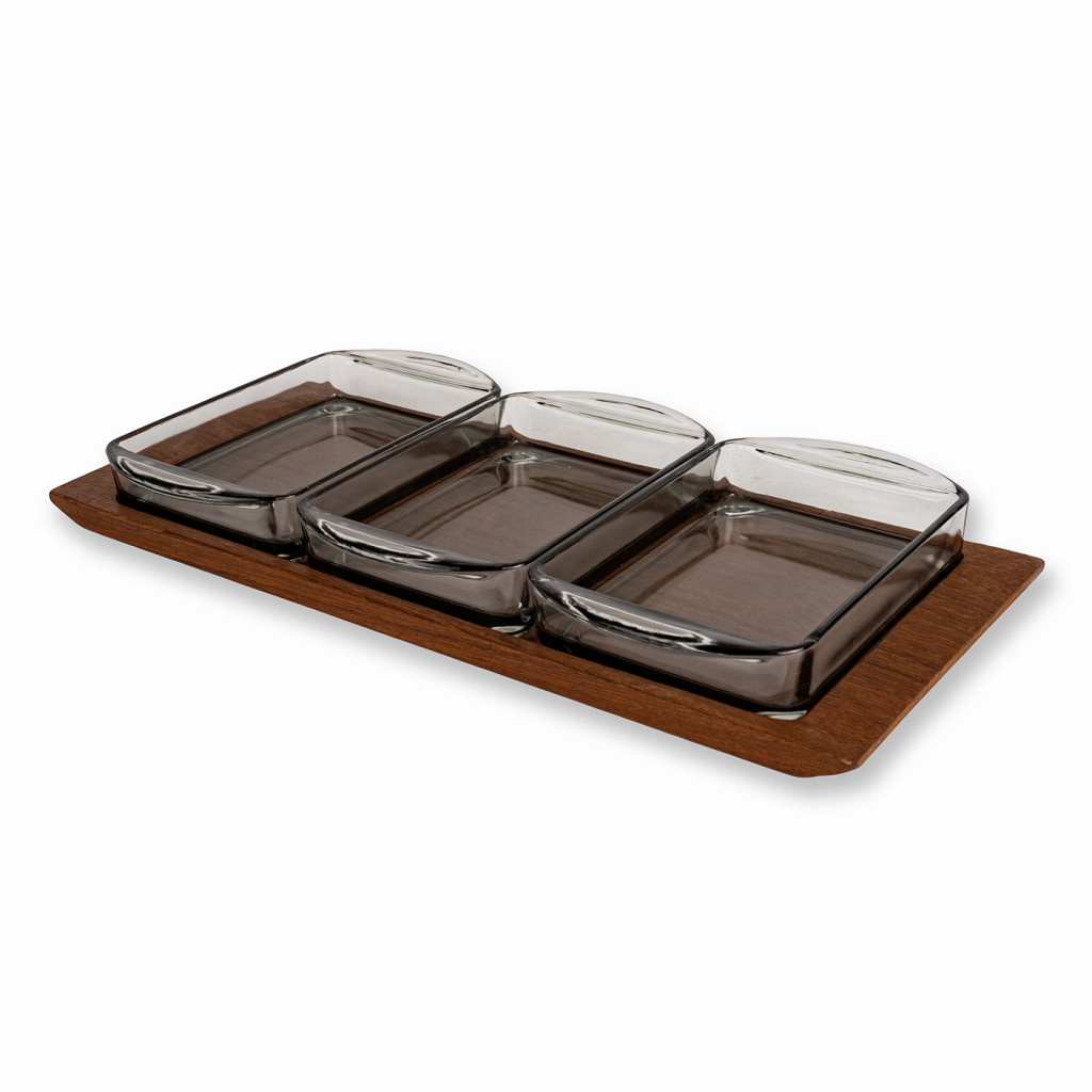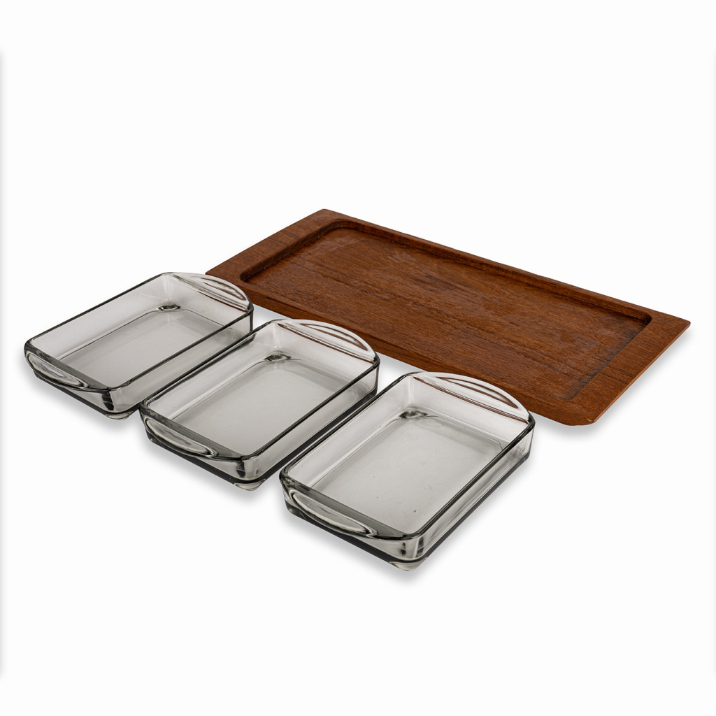 Servírovací misky vyrobené dánskou firmou Digsmed v šedesátých letech. Skleněné misky jsou zasazeny do teakového podnosu, kterým lze otáčet. Celý set je v perfektním stavu. Dřevo bylo vyčištěno a natřeno přírodním olejem na dřevo.