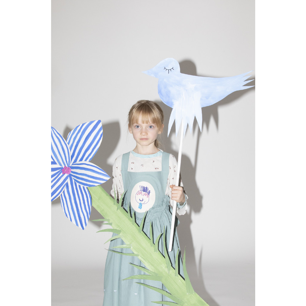 Dětské, rostoucí, modré šaty s vyjímatelnou výšivkou, jejíž motiv si dítě navrhne samo, vznikly jako spolupráce oděvní designerky Kateřiny Plamitzerové a grafického designera Františka Kasta (Kirka studio).