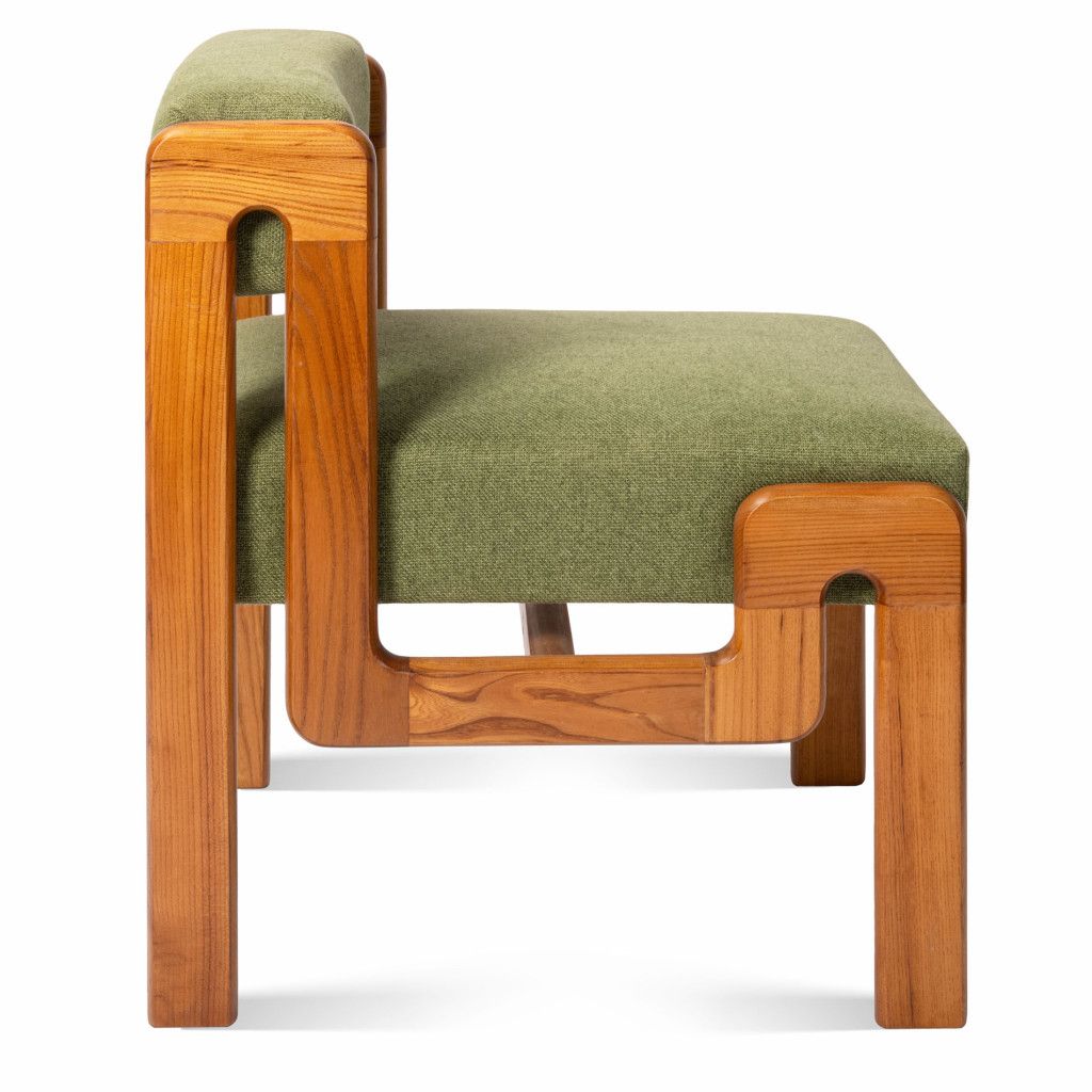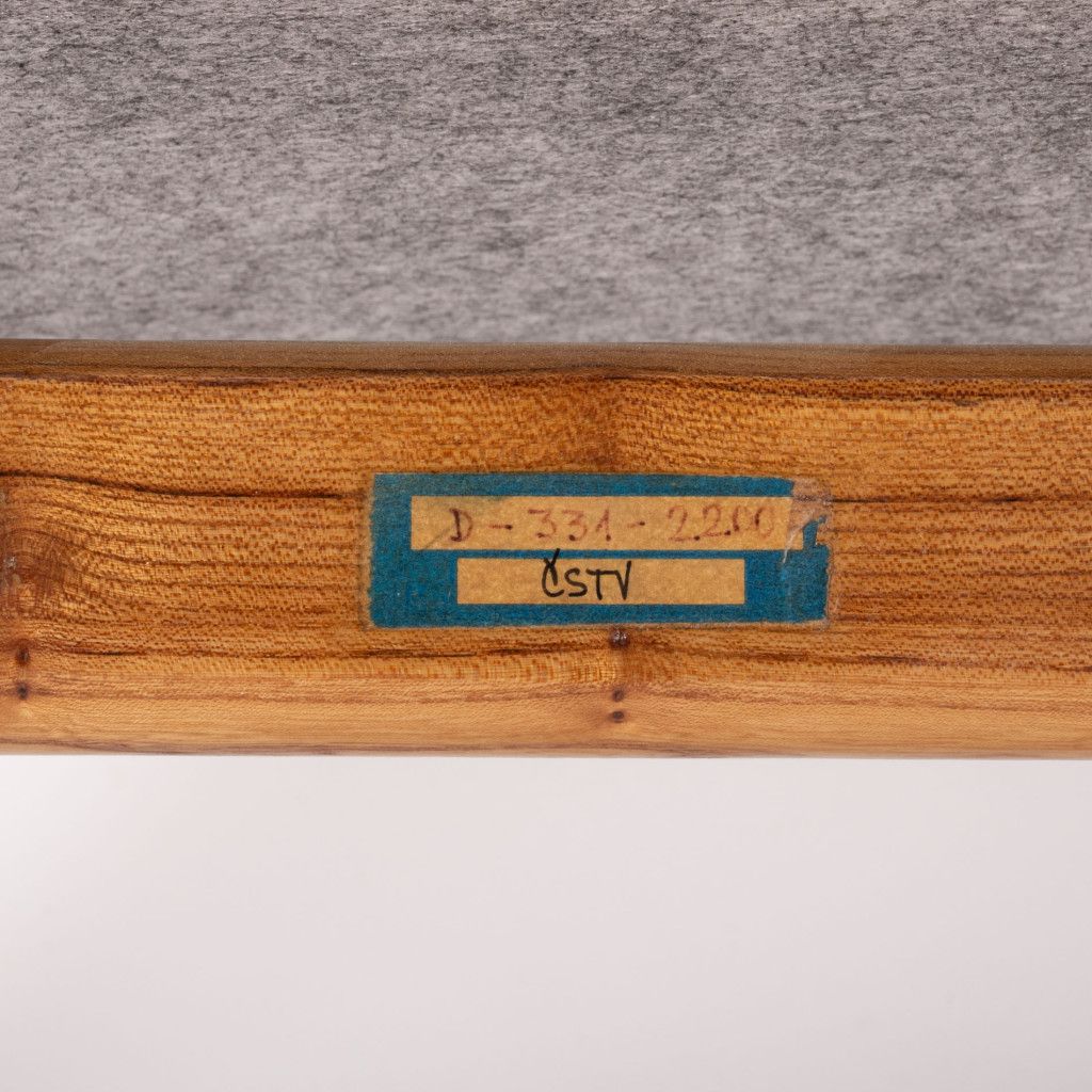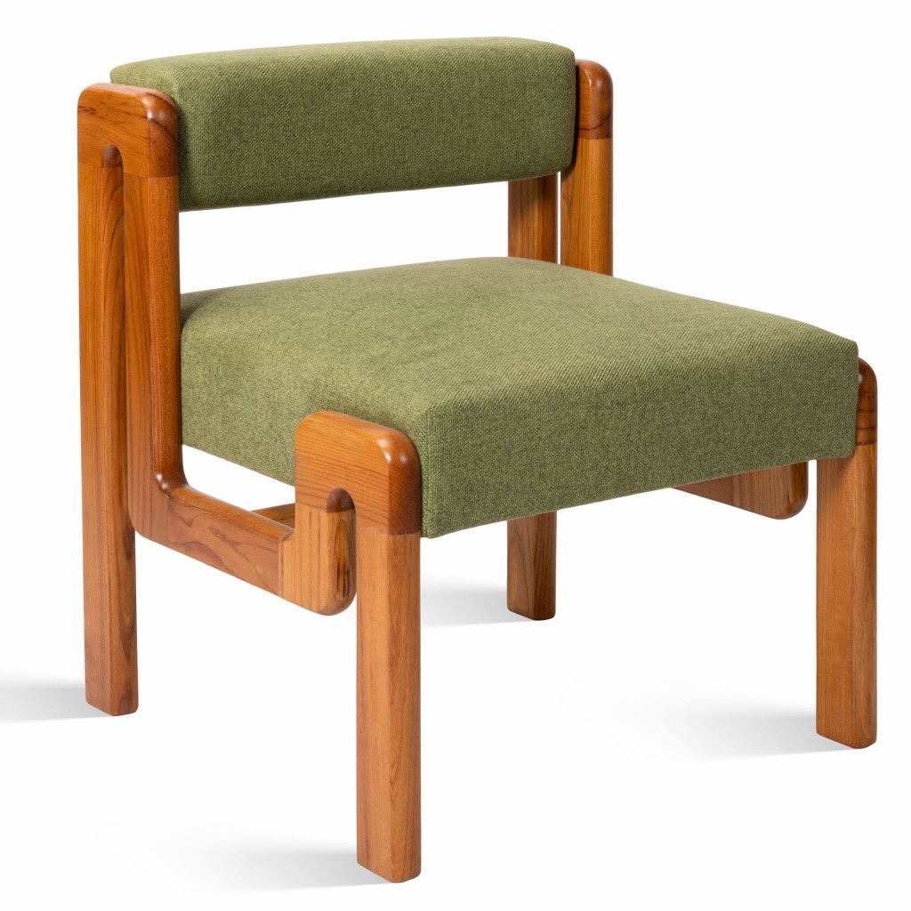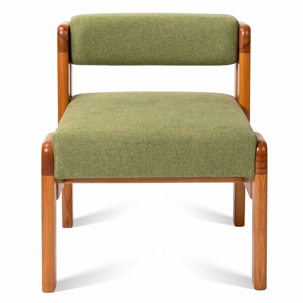 Nízké dřevěné křeslo se zajímavou geometrickou konstrukcí z jasanového masivu. Dřevo je mořené do světle hnědého odstínu v matném provedení. Sedák a opěrák jsou nově čalouněné látkou hráškové barvy. Křeslo je ve výborném stavu po kompletní renovaci v naší dílně. Tvoří pár s konferenčním stolkem, který také najdete v naší nabídce.
