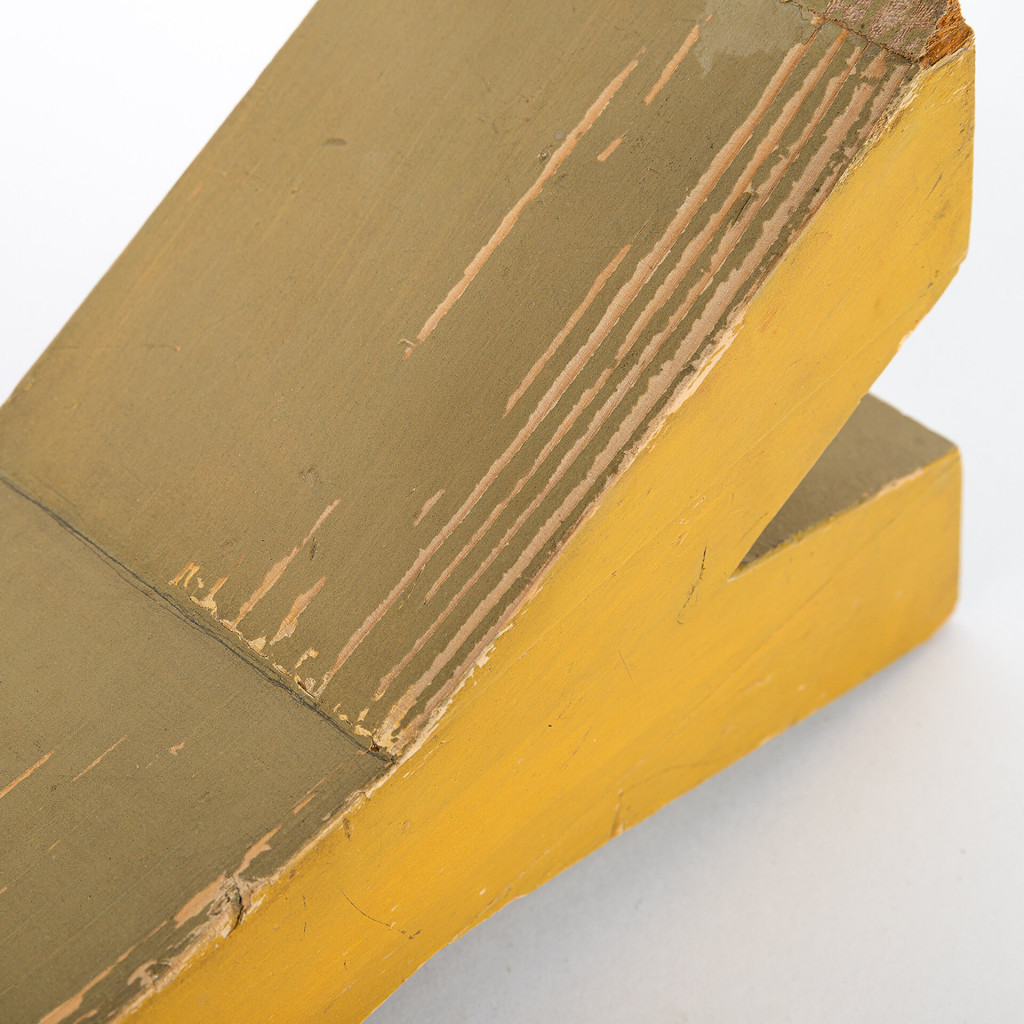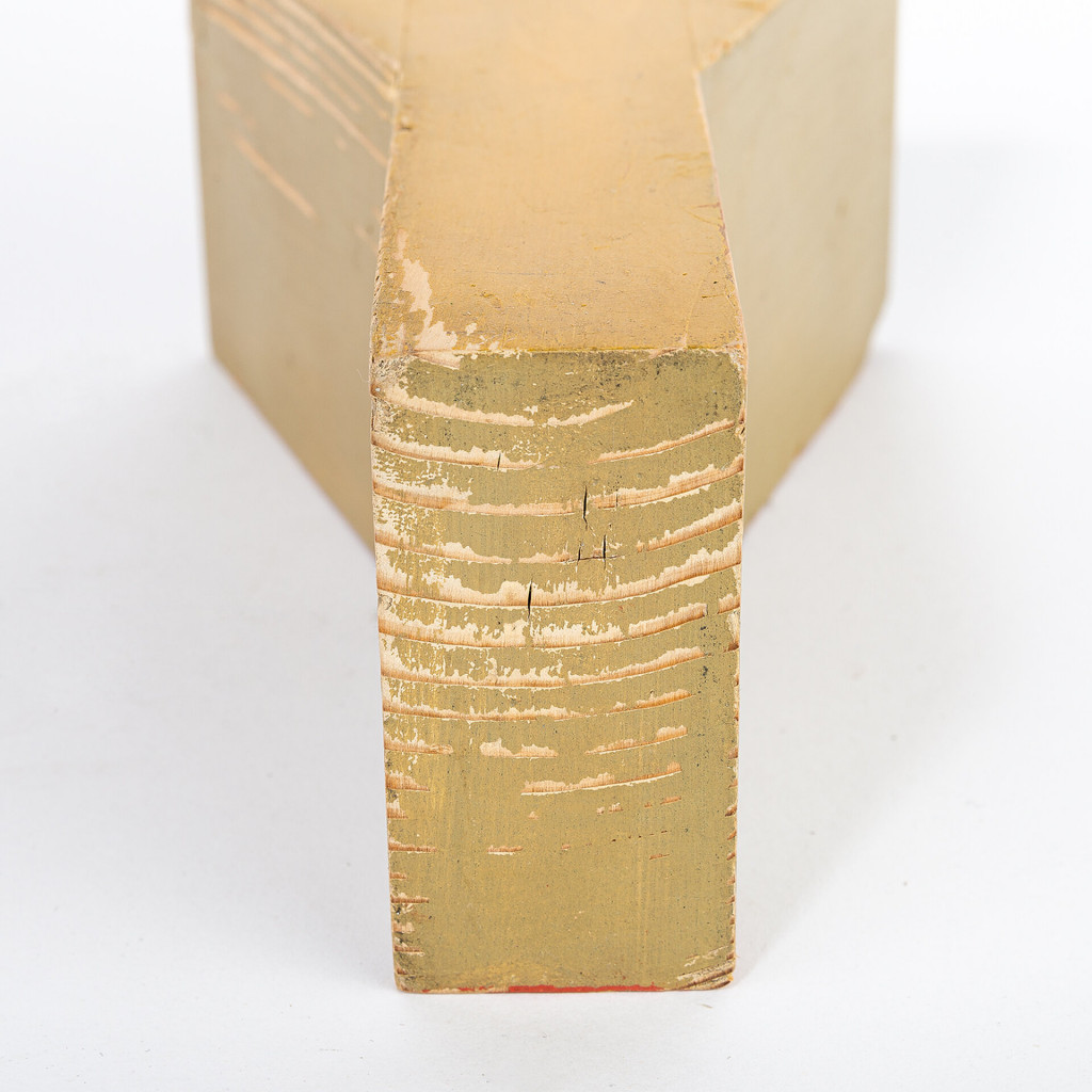 Dřevěné písmeno, které sloužilo jako pomůcka pro děti ve škole. Písmeno je z jedné strany natřeno žlutou barvou a z druhé červenou. Díky stáří a používání jsou barvy vybledlé a vytváří tak charakteristický vzhled. Písmeno je ponecháno v původním stavu s autentickou patinou a může být vynikající dekorací pro sběratele, pro školy nebo pro dětské pokoje.