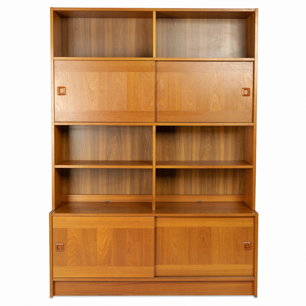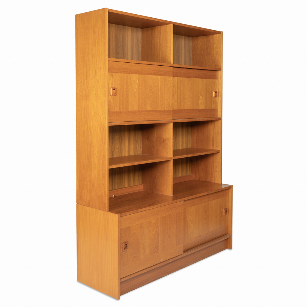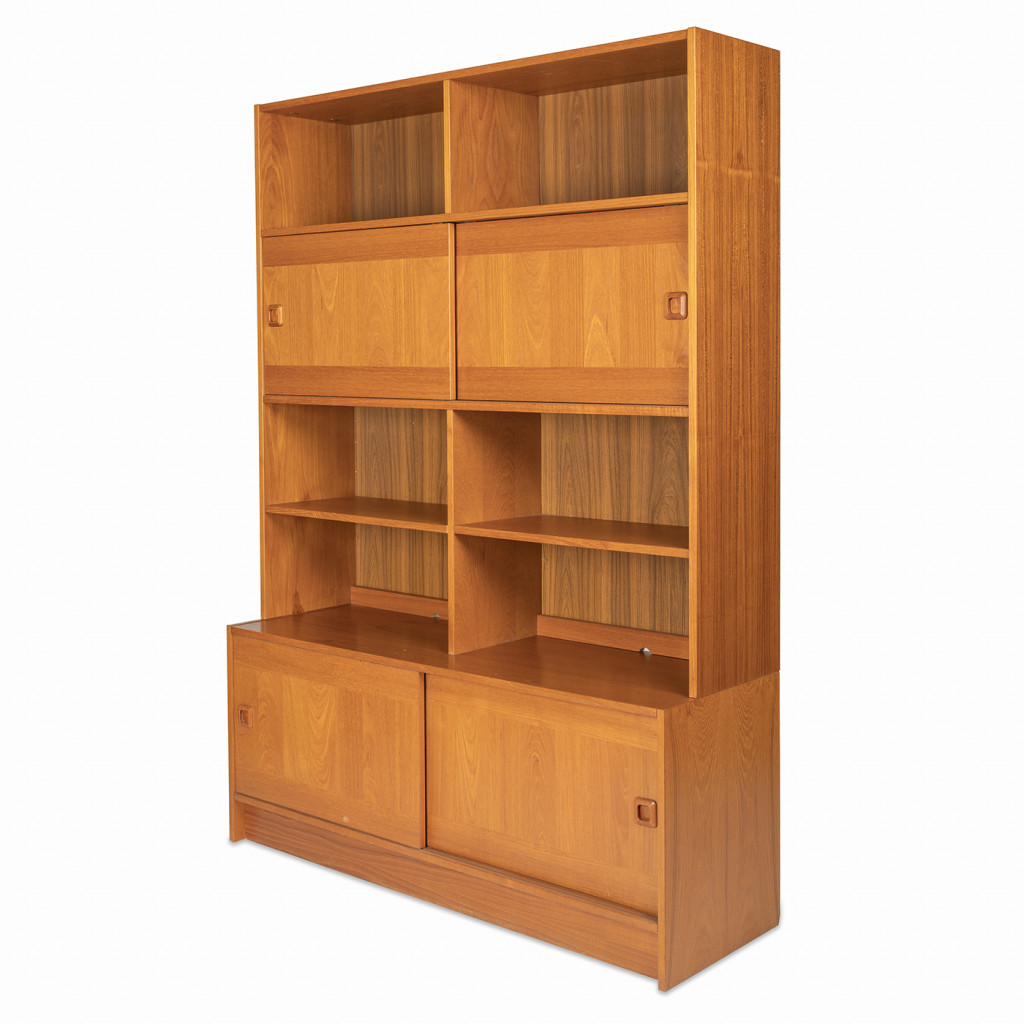 Dřevěný policový systém z šedesátých let z produkce dánské firmy Domino Møbler, jedním z významných výrobců dánského modernistického nábytku, který kombinuje minimalistické linie s přírodním dřevem. Knihovna je vyrobena z dřevotřísky, které je upraveno dýhou z teakového dřeva. Policový systém kombinuje otevřené police s úložnými prostory s posuvnými dvířky. Nábytek je ve výborném původním stavu.