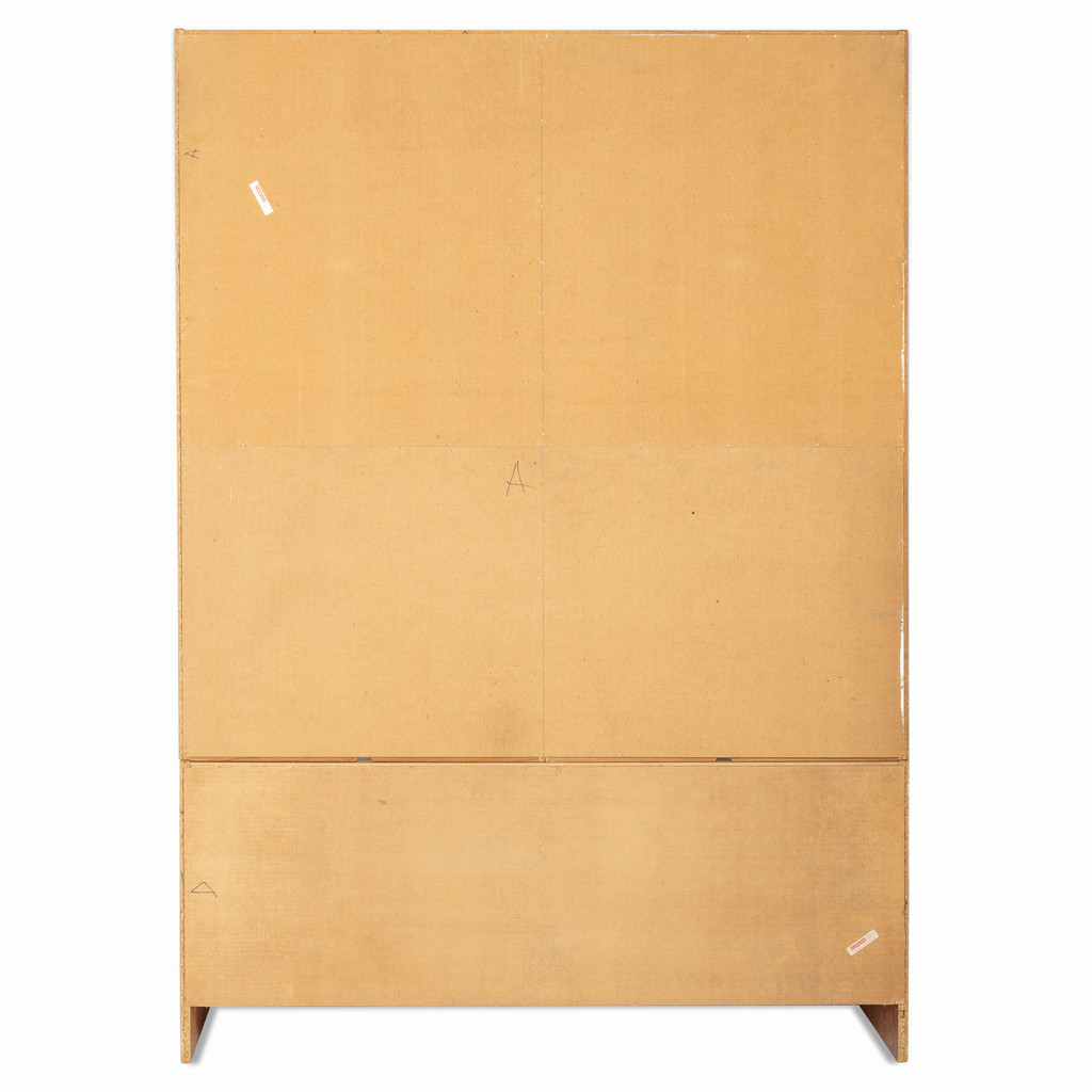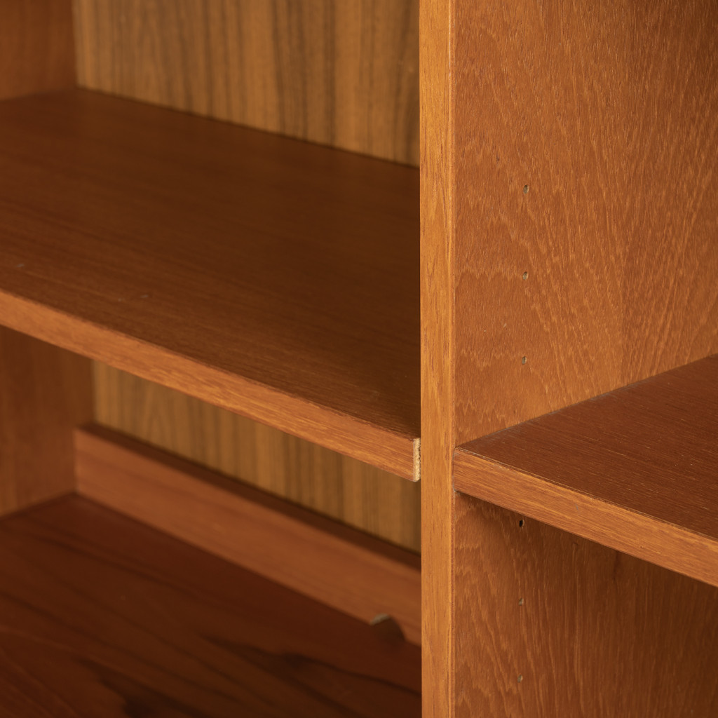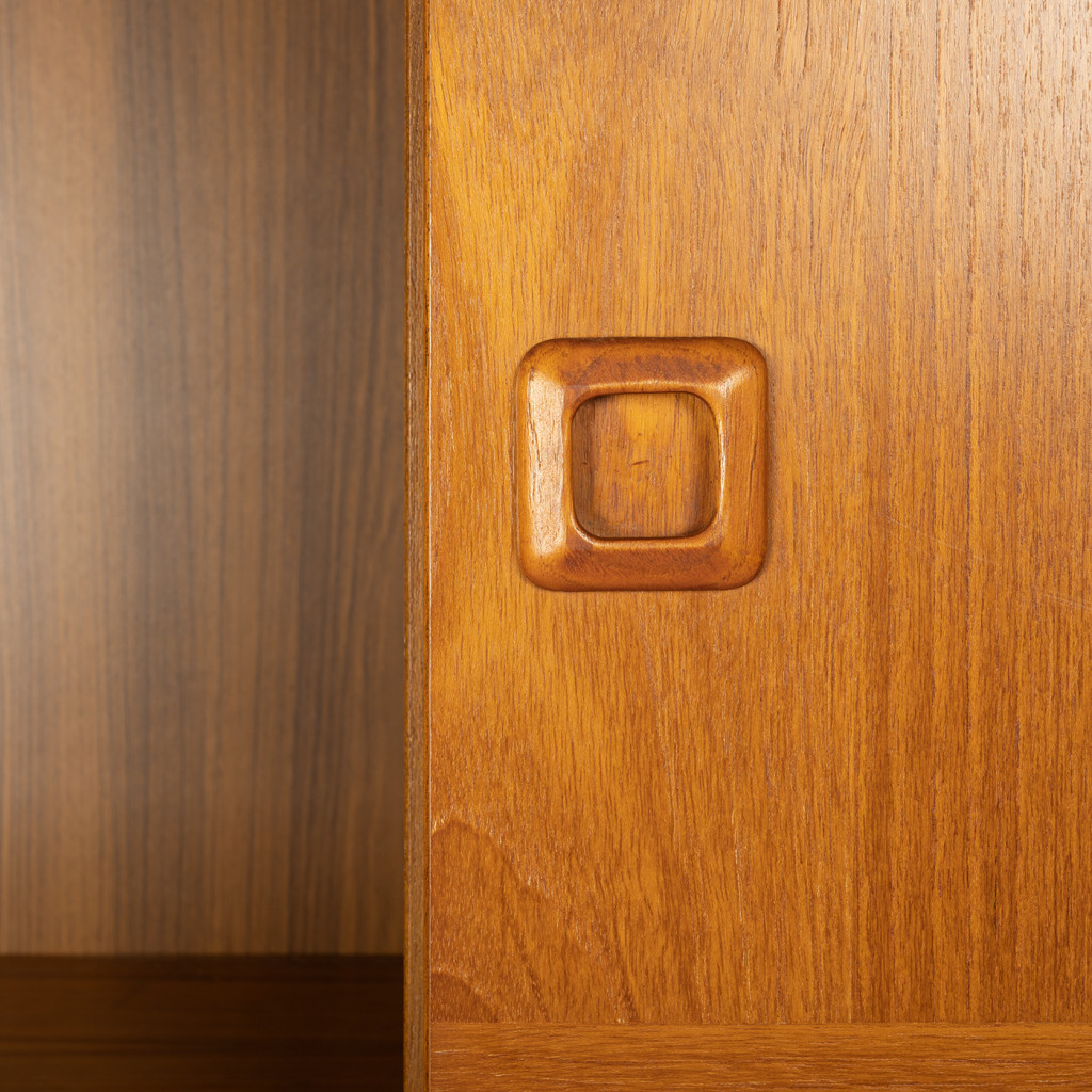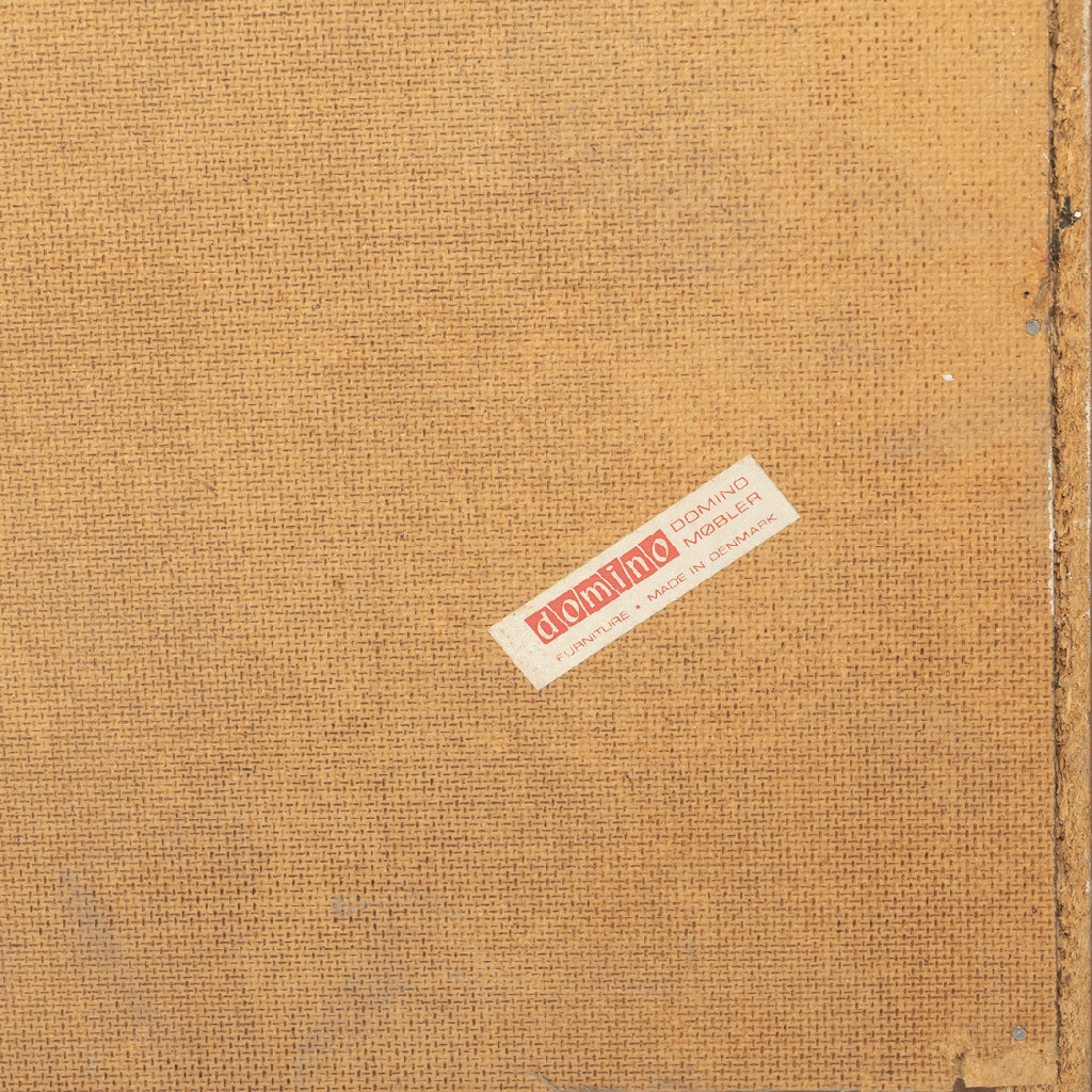 Dřevěný policový systém z šedesátých let z produkce dánské firmy Domino Møbler, jedním z významných výrobců dánského modernistického nábytku, který kombinuje minimalistické linie s přírodním dřevem. Knihovna je vyrobena z dřevotřísky, které je upraveno dýhou z teakového dřeva. Policový systém kombinuje otevřené police s úložnými prostory s posuvnými dvířky. Nábytek je ve výborném původním stavu.