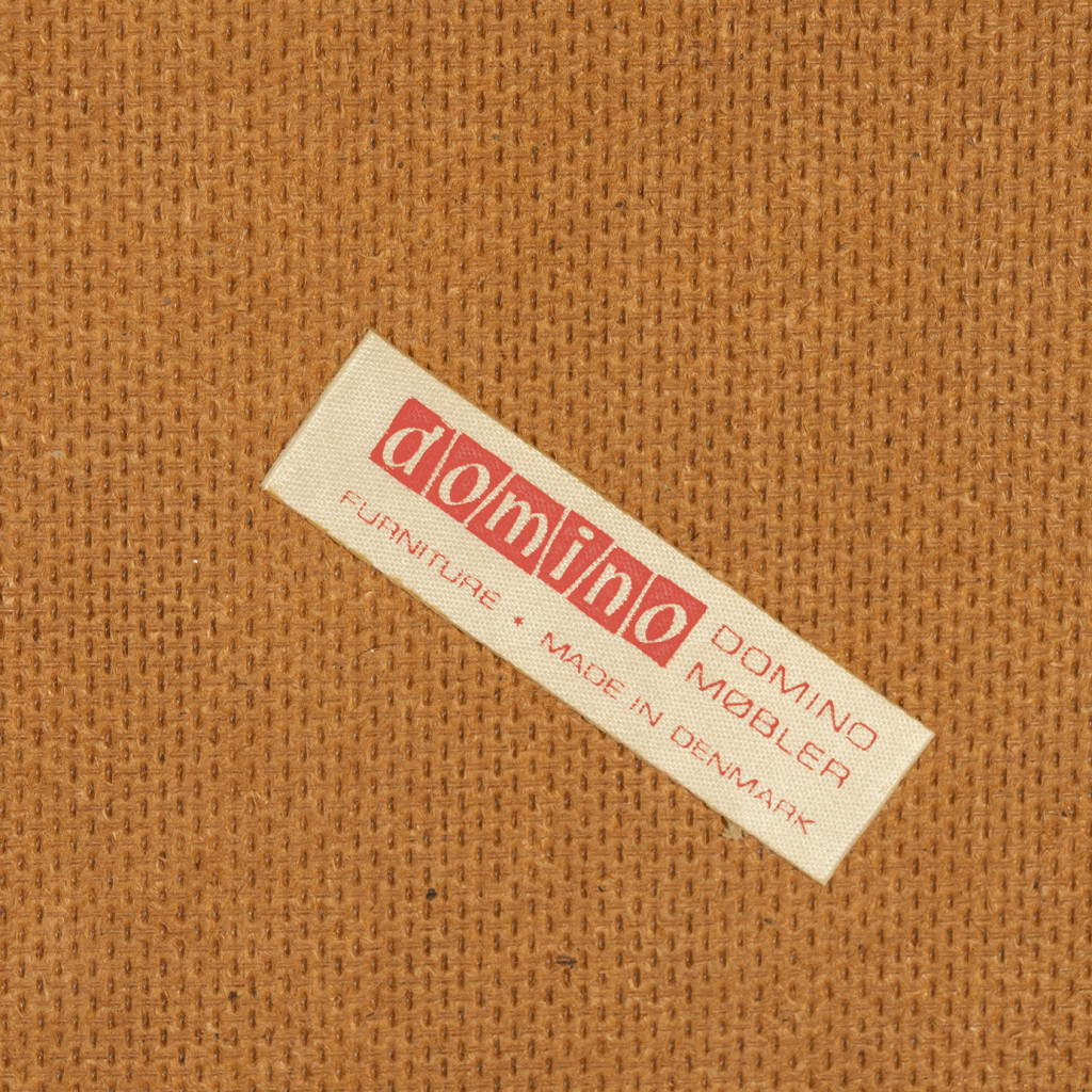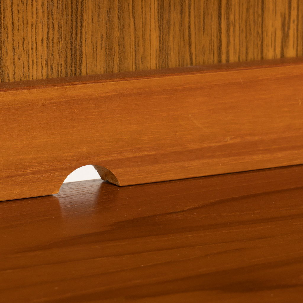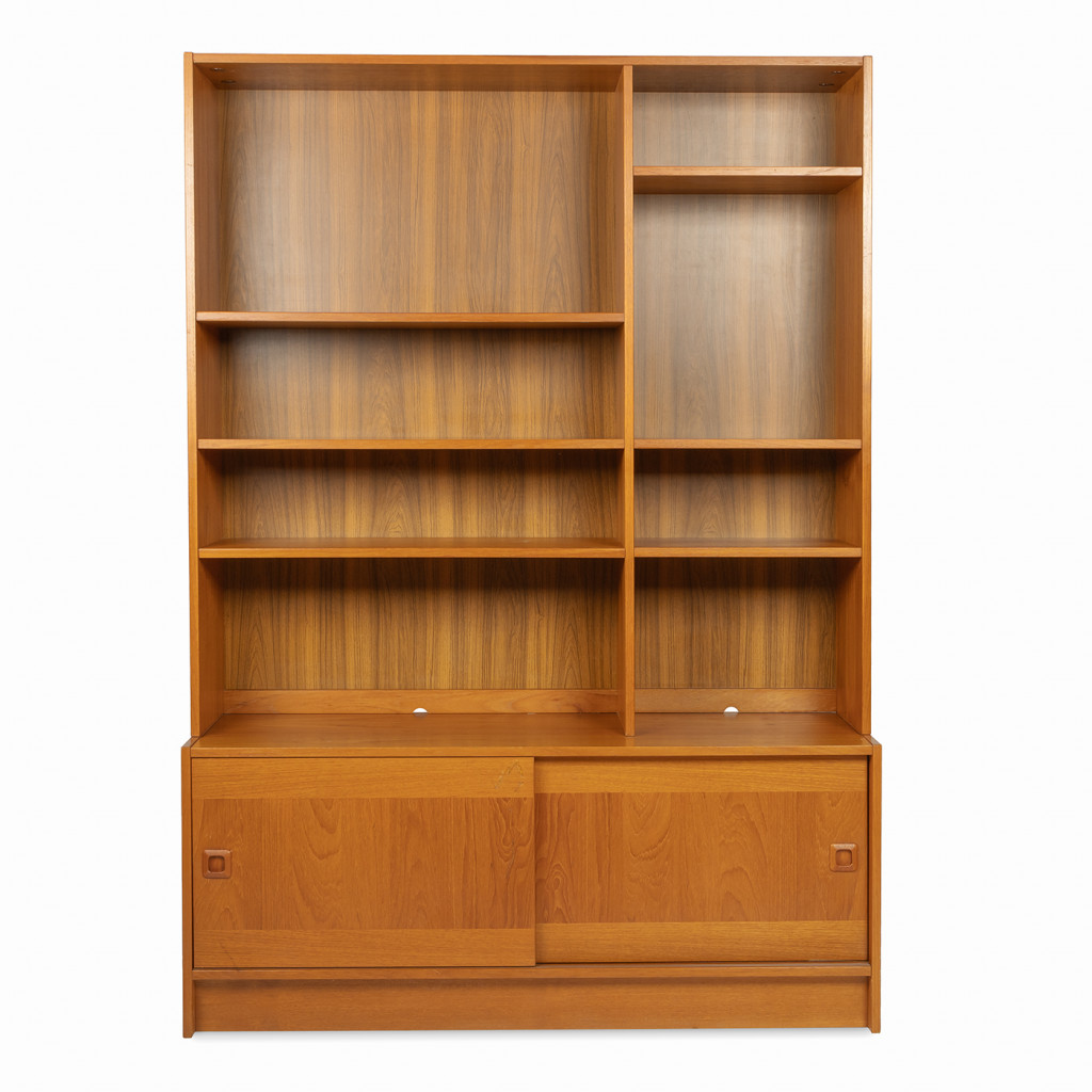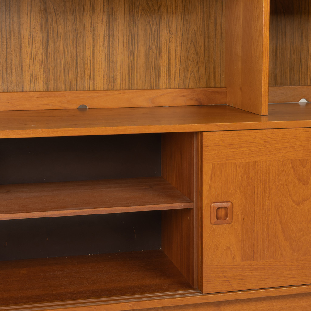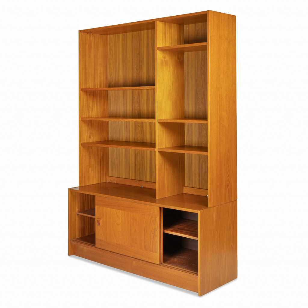 Dřevěný policový systém z šedesátých let z produkce dánské firmy Domino Møbler, jedním z významných výrobců dánského modernistického nábytku, který kombinuje minimalistické linie s přírodním dřevem. Knihovna je vyrobena z dřevotřísky, které je upraveno dýhou z teakového dřeva. Policový systém kombinuje otevřené police s úložnými prostory s posuvnými dvířky. Nábytek je ve výborném původním stavu.