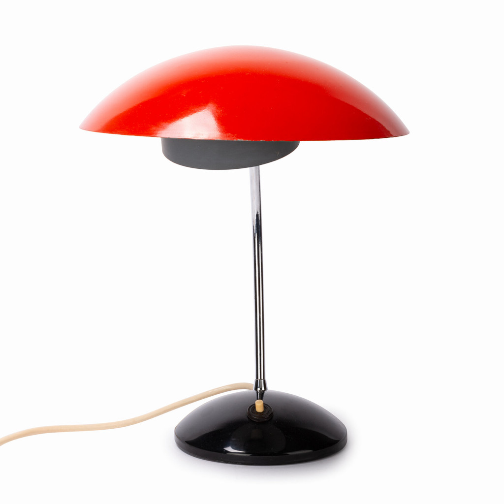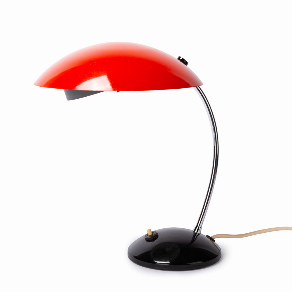 A table lamp produced by a Czech company, Drukov, as the type 1863/1. The still operating company based in Brno was founded in the late forties and consisted of many branches of diverse metal production. This lamp was probably manufactured in the late sixties. The metal lamp shade painted brightly red is shaped as a section of a sphere, it is connected with the black plastic covered base by a curved chromium-plated rod. There is a secondary shade around the lightbulb that directs the light onto the work desk. The lamp has been left in its original condition which is excellent considering its age.