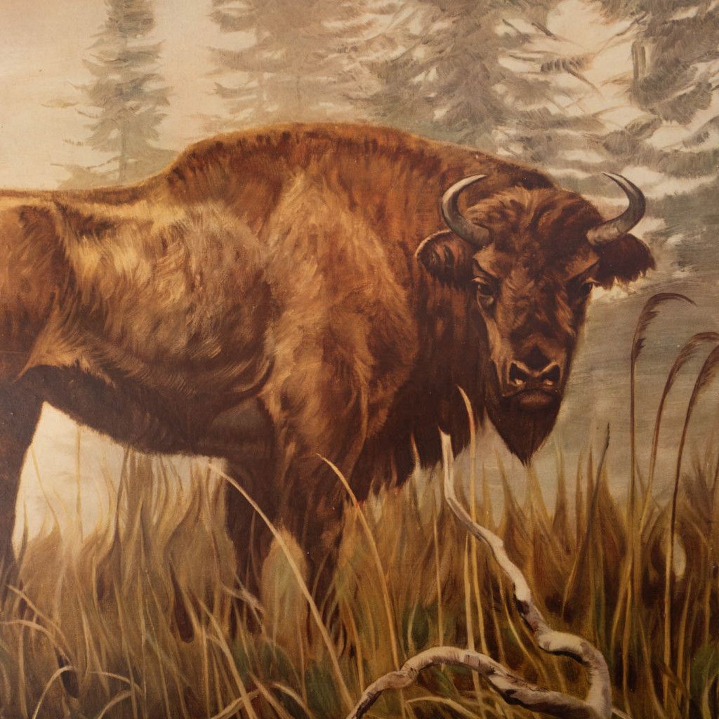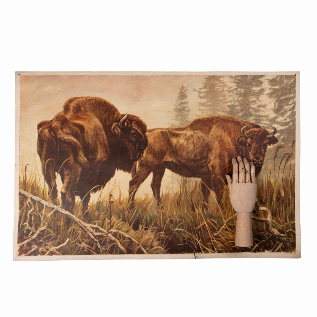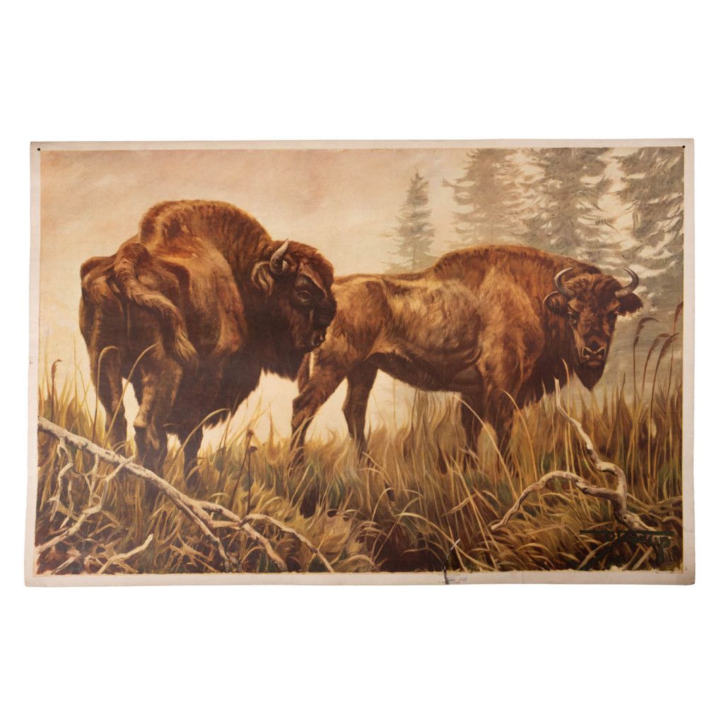Beautiful First Republic-era school poster depicting two European bison (Bison bonasus) on a grassy plain. It is a color print from 1933 and comes from the series Czech Zoological Images by the painter Janez Mihael Gorup. The poster is printed on thick paper. It is in very good original condition; the paper is torn in one spot on the bottom.