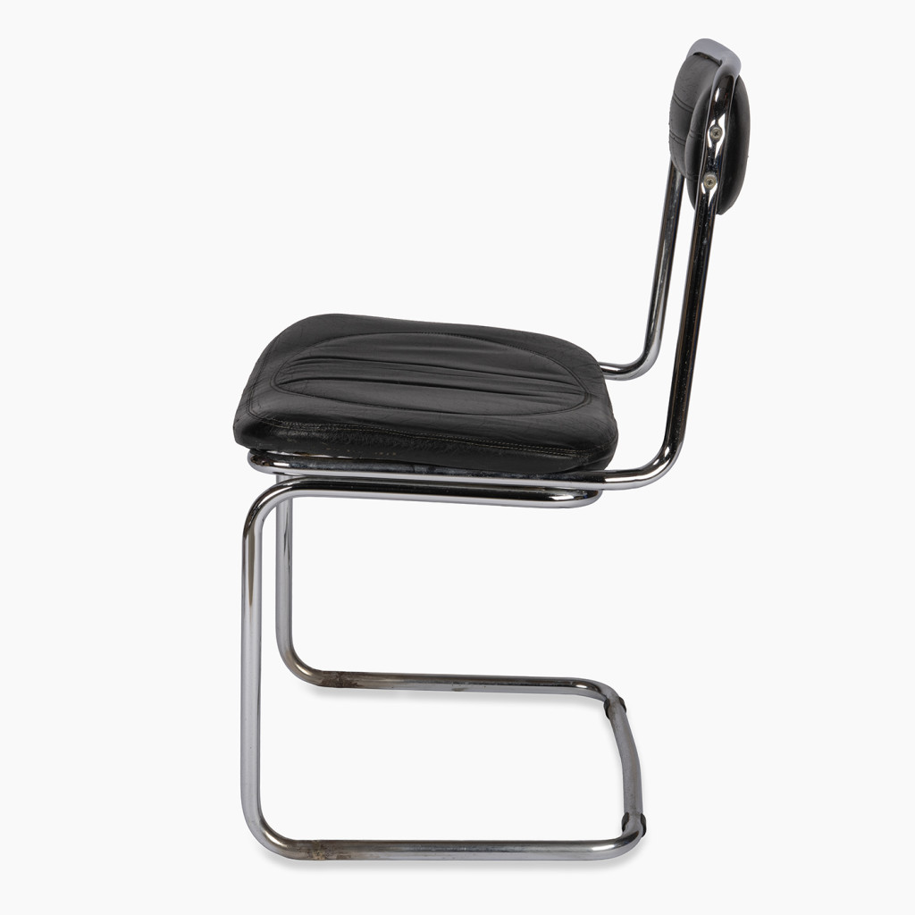 Tube chair with chrome steel base and seat and backrest made of soft black leatherette, decorated with interesting geometric stitching.