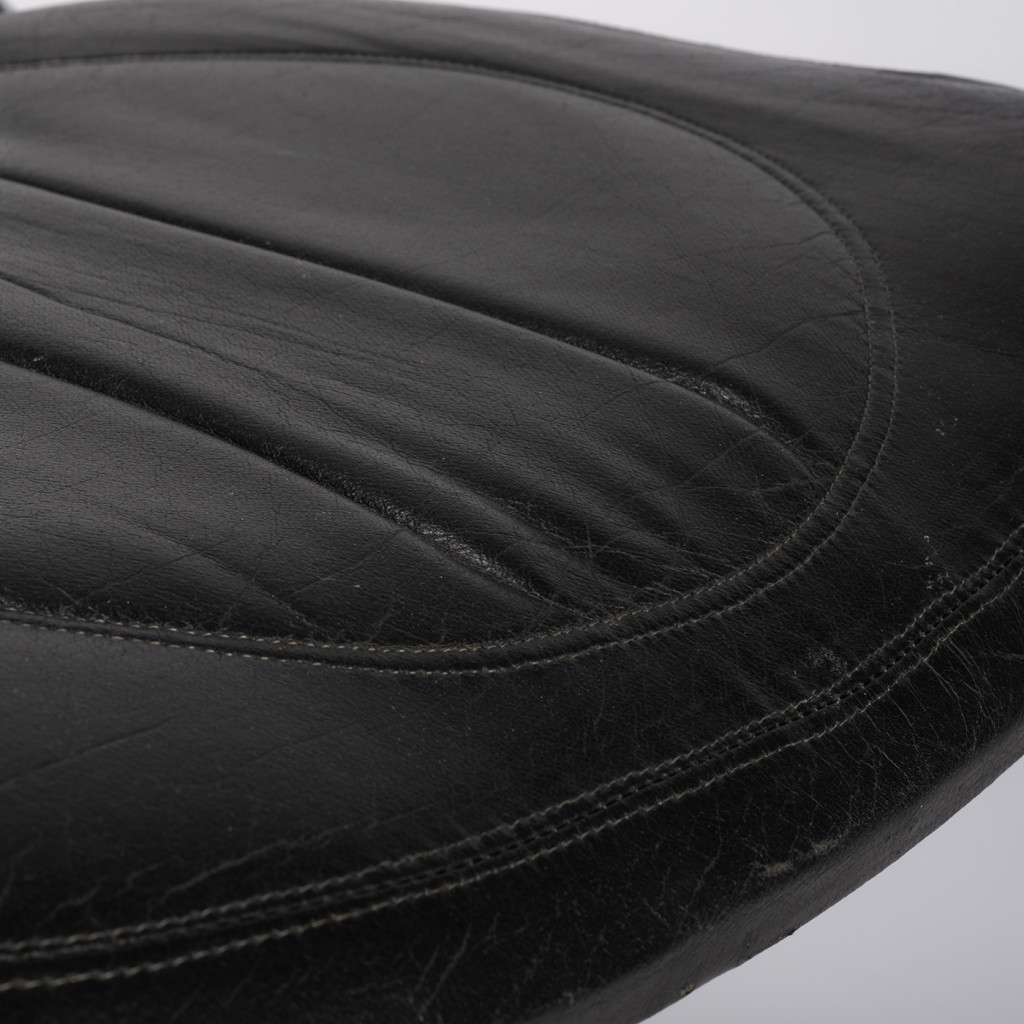 The chair is left in its original condition. The leatherette is slightly worn from use and the base is scratched in places.