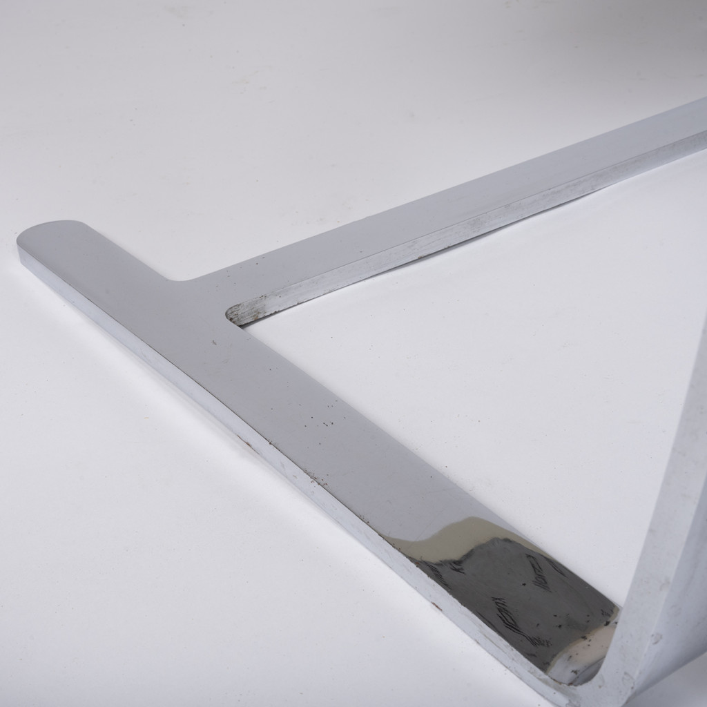 The chrome-plated steel frame supports a seat with cream leather armrests and gently rocks thanks to its curved design. The seat is very comfortable and is covered with fabric with black and white KNOLL lettering on the underside. The chair is in great original condition, with minor scratches on the chrome in places, as can be seen in the photos.