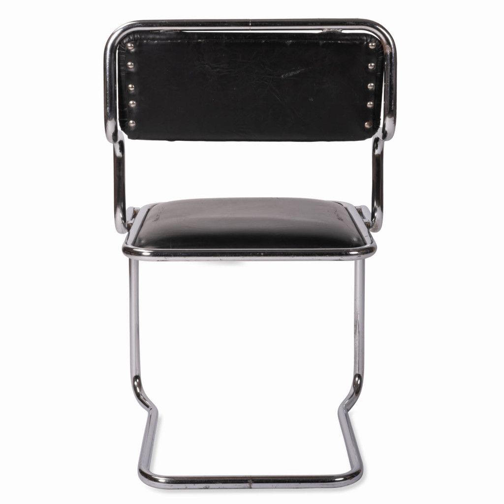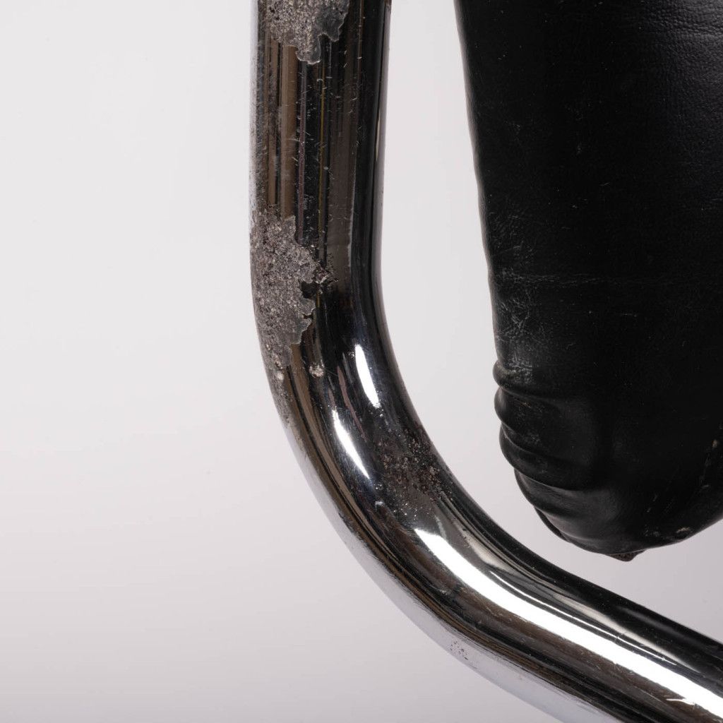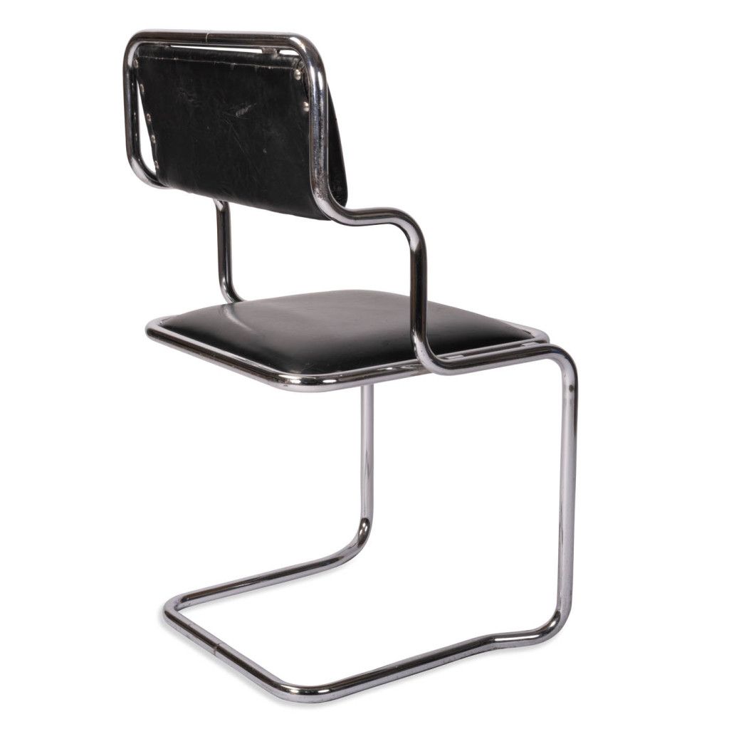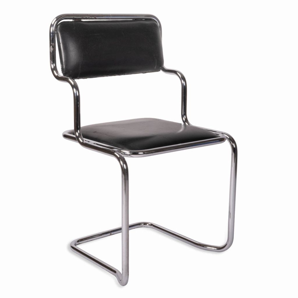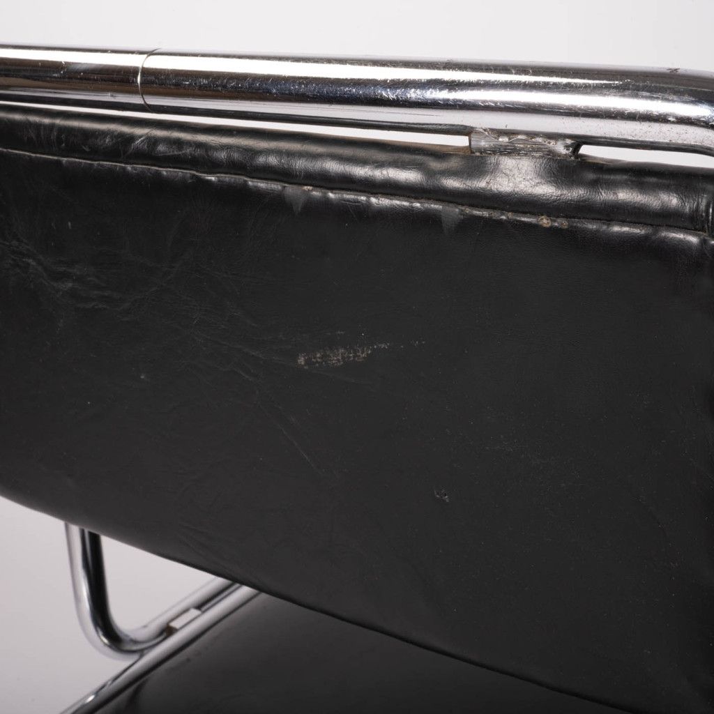 The chair features a frame made of bent chrome-plated steel tubing; the seat and backrest have a plywood base, are padded, and covered in black leather. The frame narrows at the bottom. It is in good original condition. The leather is slightly scratched and the chrome plating is scuffed in places, as shown in the photographs.