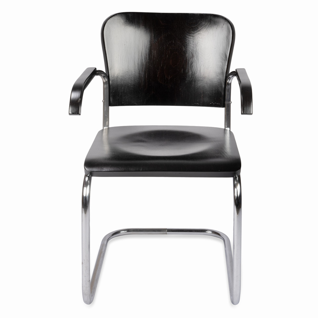 The chair has a bent tubular chrome plated steel structure which has been thoroughly cleaned and has only minor scuffs. The wooden parts are made from a combination of solid beech and plywood with a black stained finish.