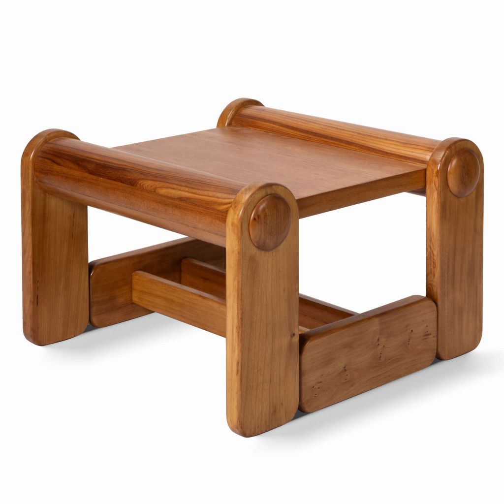 Low coffee table with an interesting geometric design made of solid ash. The wood is stained a light brown shade with a matte finish. The table is in great condition after a complete renovation in our workshop. It forms a pair with a matching armchair, which you can also find in our selection.