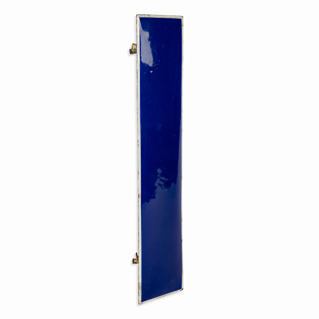 Enamelled letter from the original sign in a simple font. The front of the letter is slightly curved to give a plastic effect and is painted dark blue with a white outline. The letter is in its original condition with an authentic patina. The varnish is damaged in places. The original mounting on the other side is damaged.