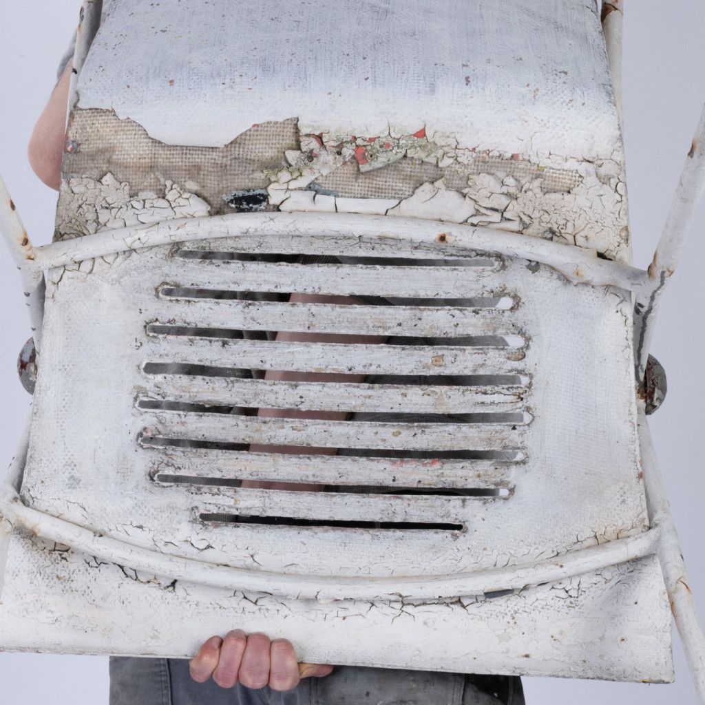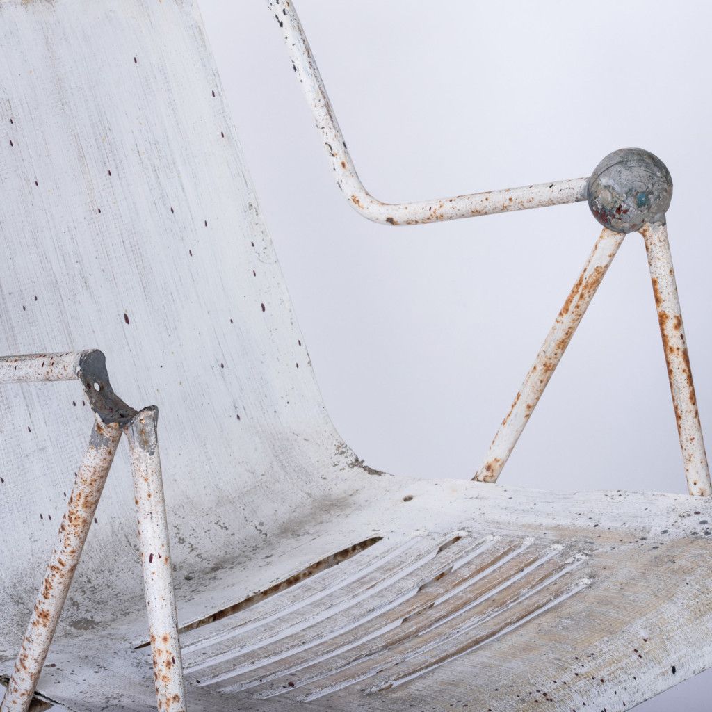 Garden chair with a very unique shape. The chair has a sturdy metal frame and a laminate shell. Wooden balls are located at the ends of the armrests. One of the chairs has only one ball. The chair has a distinctive patina and is intended for renovation.
