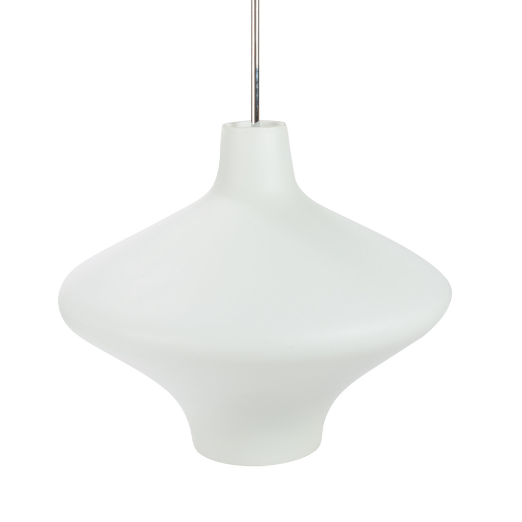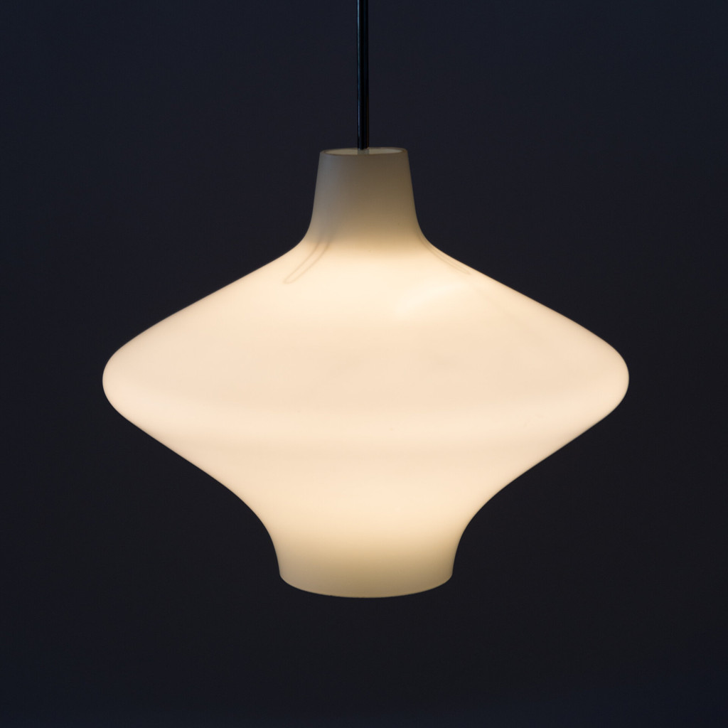 This chandelier was manufactured by the glass factory Osvětlovací sklo in Valašské Meziříčí, the Czech Republic in the seventies. The glassworks in Valašské Meziříčí belonged to a company S. Reich & Co, once the largest producer of illuminating glass in Austria-Hungary. The chandelier has a glass shade made of opaque glass in matte finish. The shape of the lampshade corresponds to the futuristic tendencies of the seventies that were influenced by the Space Age era. The chandelier is hung on a metal rod of silver, it is fully functional, in an excellent original condition.