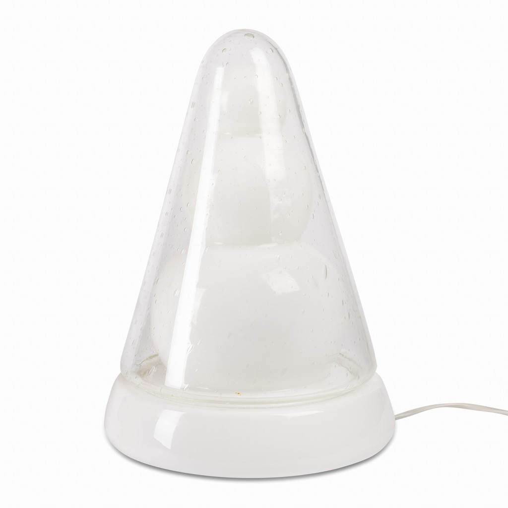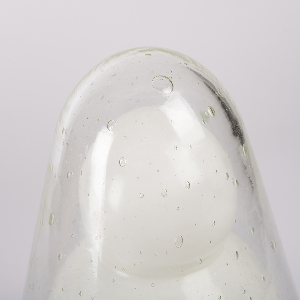 Atypical table lamp made of several layers of glass. The shaped inner part in frosted glass is covered by a rounded needle in clear glass with sealed bubbles. When lit, the frosted glass creates a pleasant diffused light, while the shape of the inner part stands out. The lamp is fully functional and has been left in its original condition.