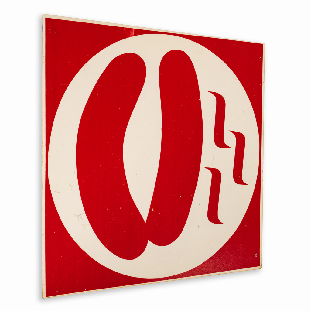 Wall sign from a hot dog shop. The sign is made of plastic with a simple picture of hot dogs. The colour is scratched in some places. There is a small nail hole in each corner to attach it to the wall.
