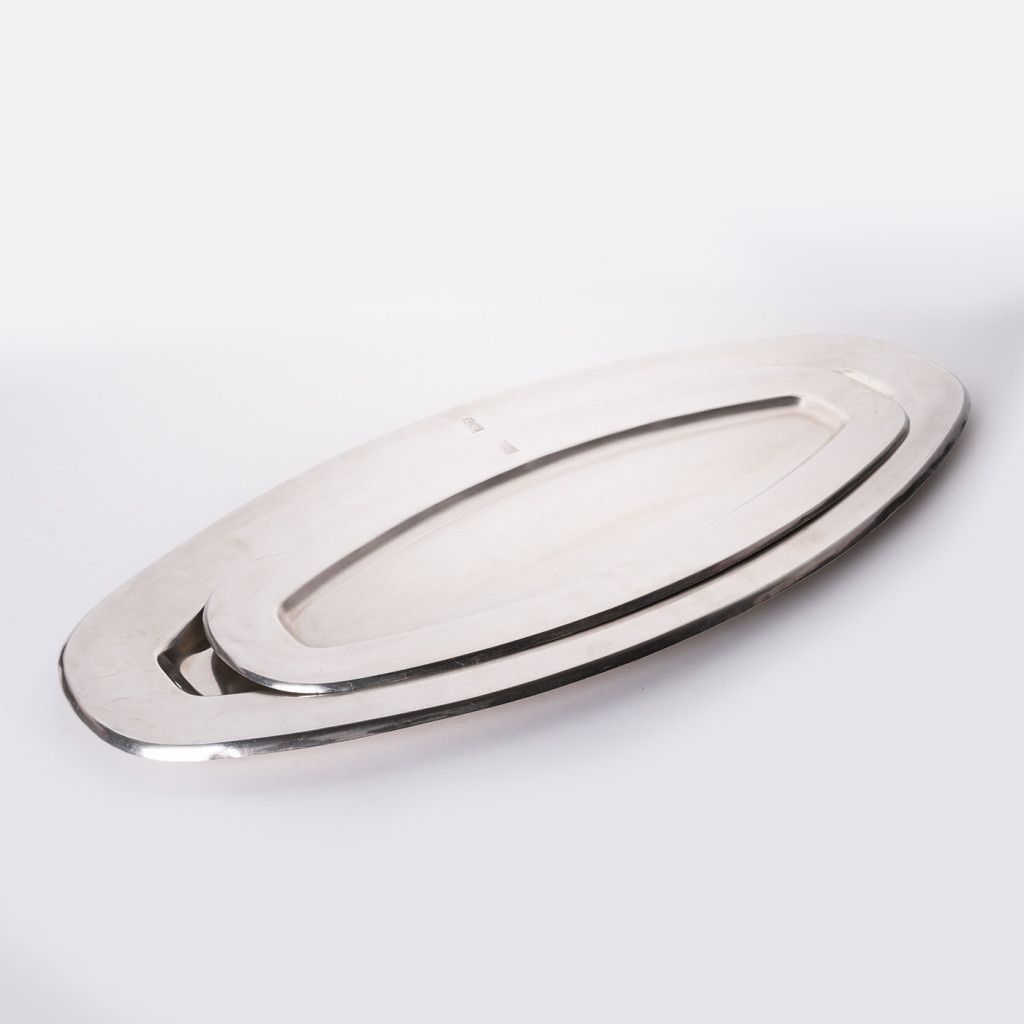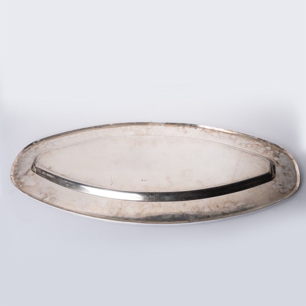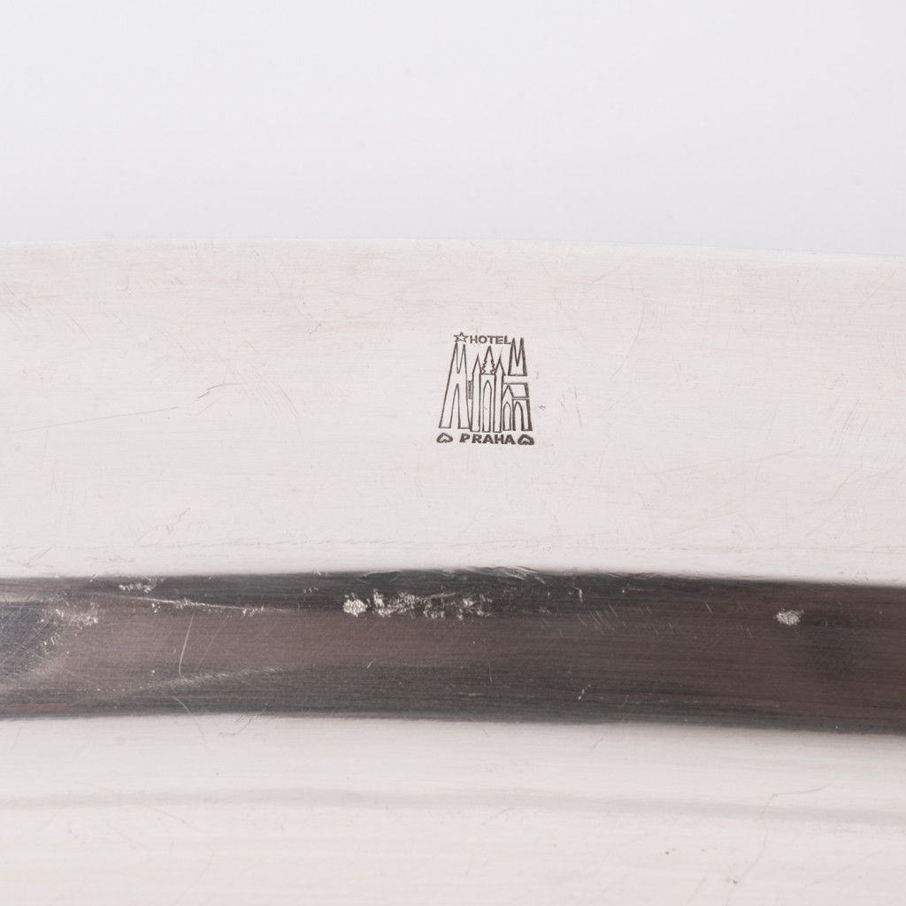 Hotel Praha was the absolute peak among the Czechoslovak hotels. It was the most luxurious accommodation facility built exclusively for the Communist Party and its guests, and ordinary citizens were not allowed access. We have managed to salvage several unique items during its demolition in 2014, including this fish tray, made out of white silver-plated brass (alpaca). The photo is for illustrative purposes; each piece has a slightly different patina and imperfections. Due to its age, each piece has surface damage from scratches or corrosion. The tray has been thoroughly cleaned.
