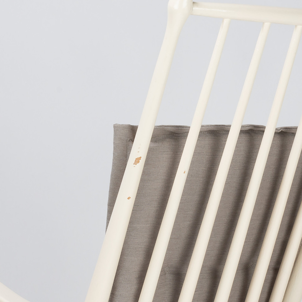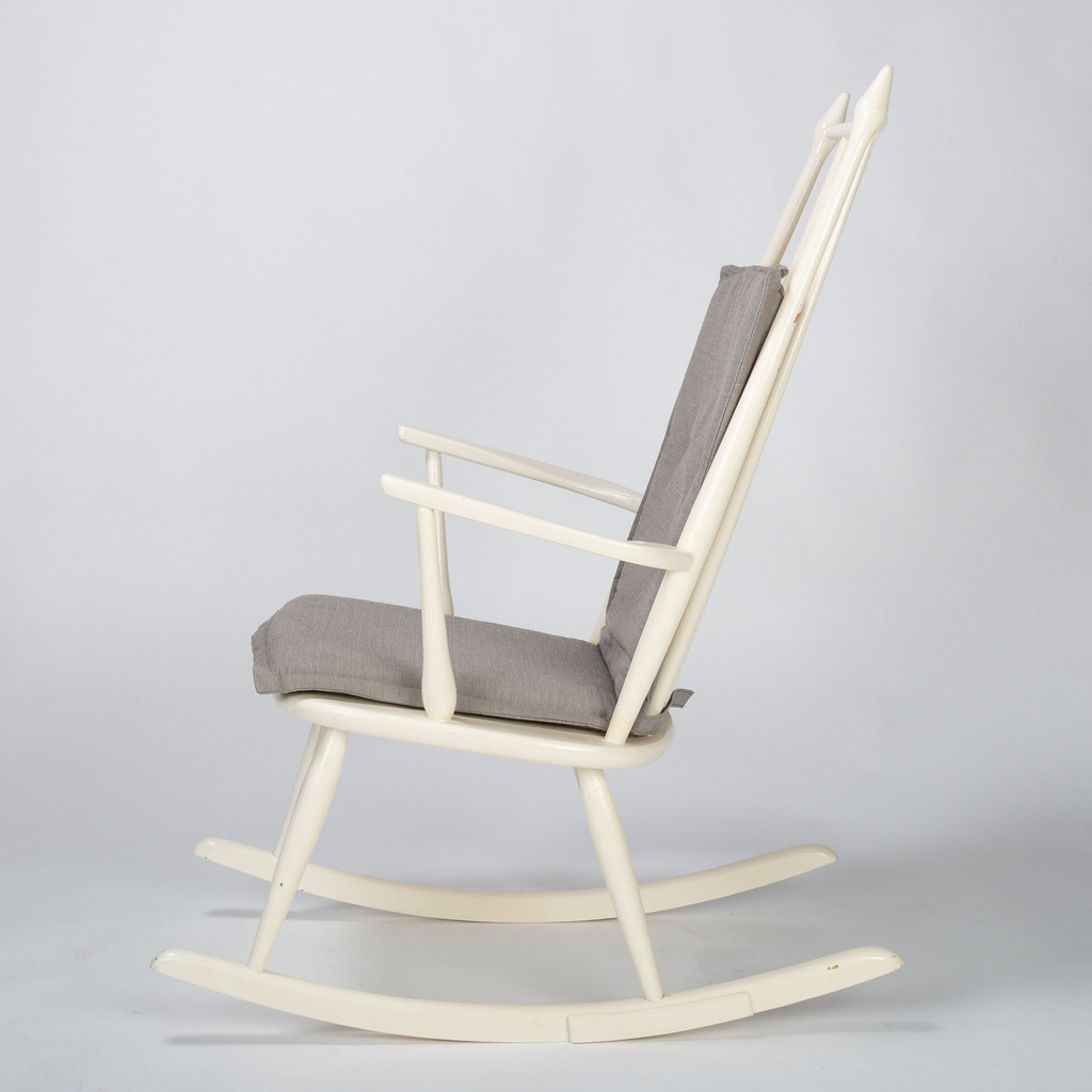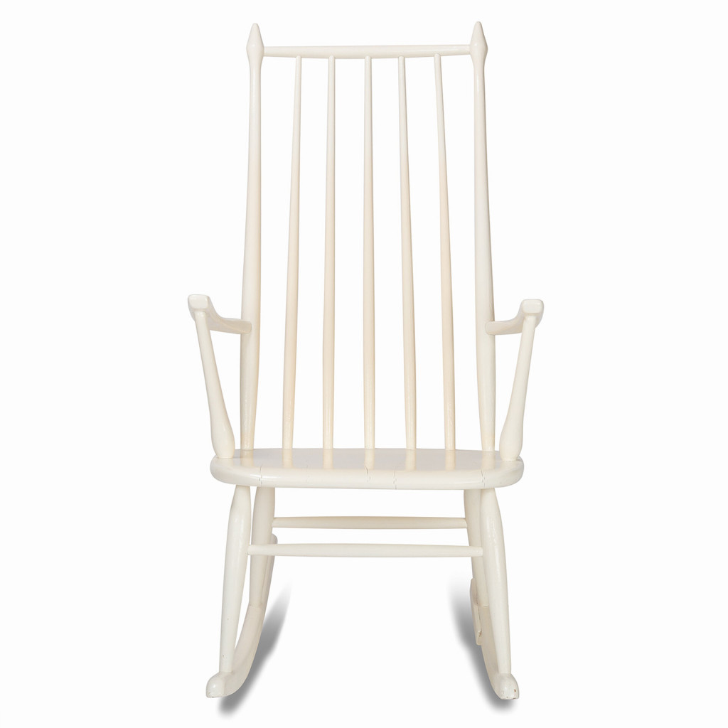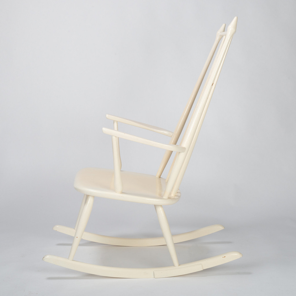 Rocking chair made in Finland in the 1960s. The chair is inspired by the design of Lena Larsson and Ilmara Tapiovaara. Its construction is made of wood and painted white. The right leg of the chair is reinforced with a wooden slat painted white. These rocking chairs are still found in many homes and are a desirable product for those looking for a quality and stylish piece of furniture.