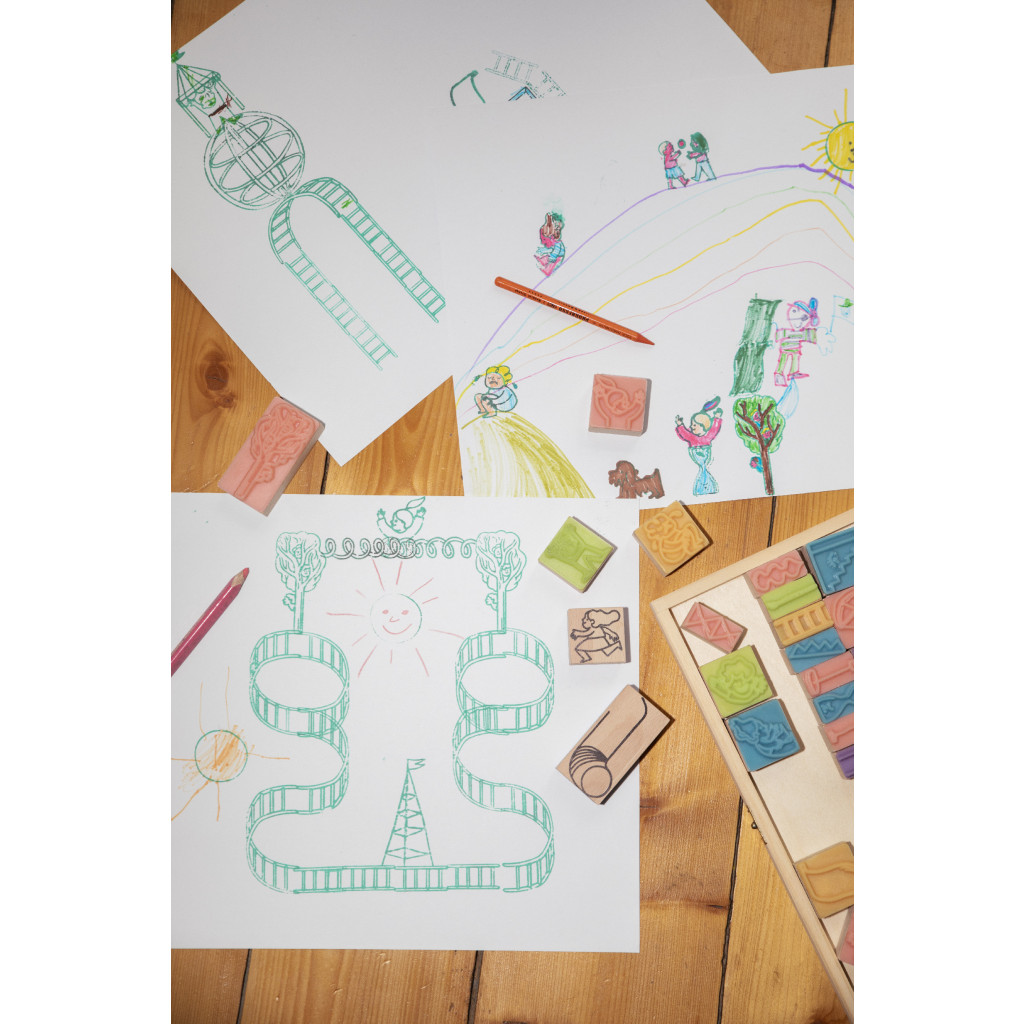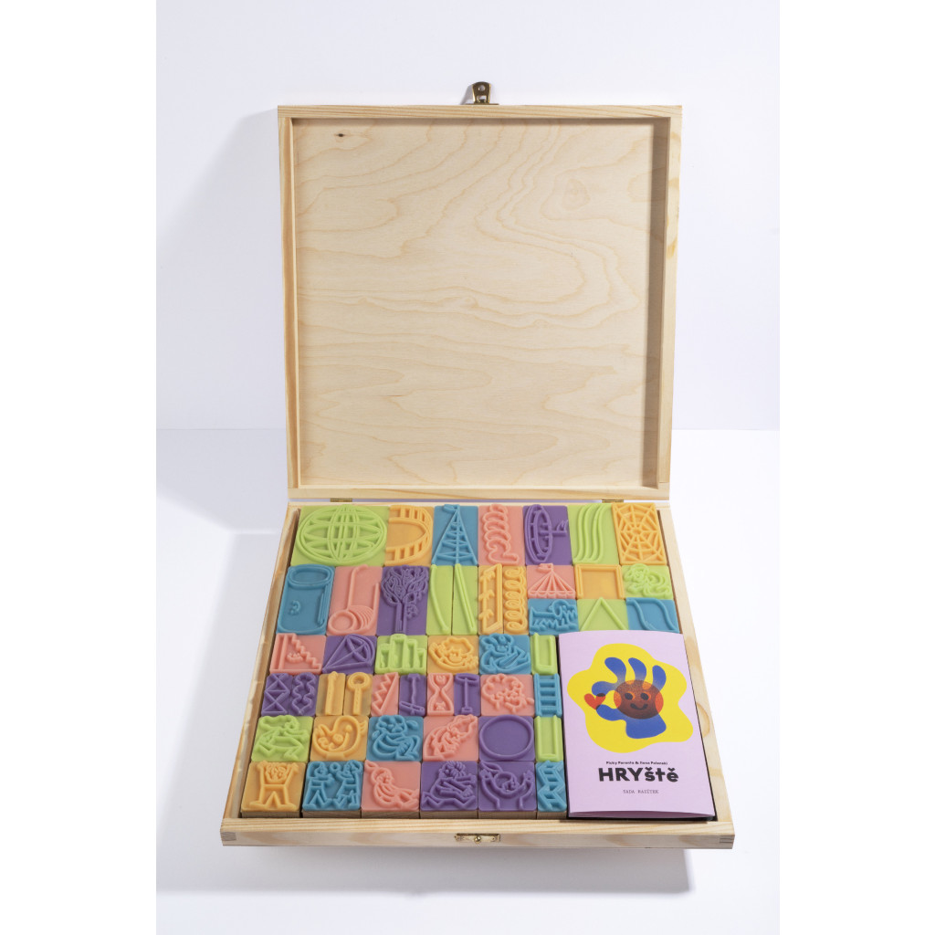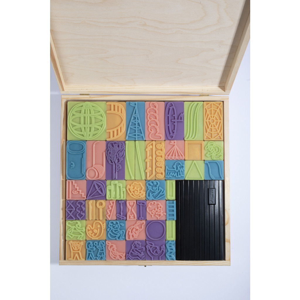 The set contains 48 stamps. The set includes a stamp pad filled with black ink.