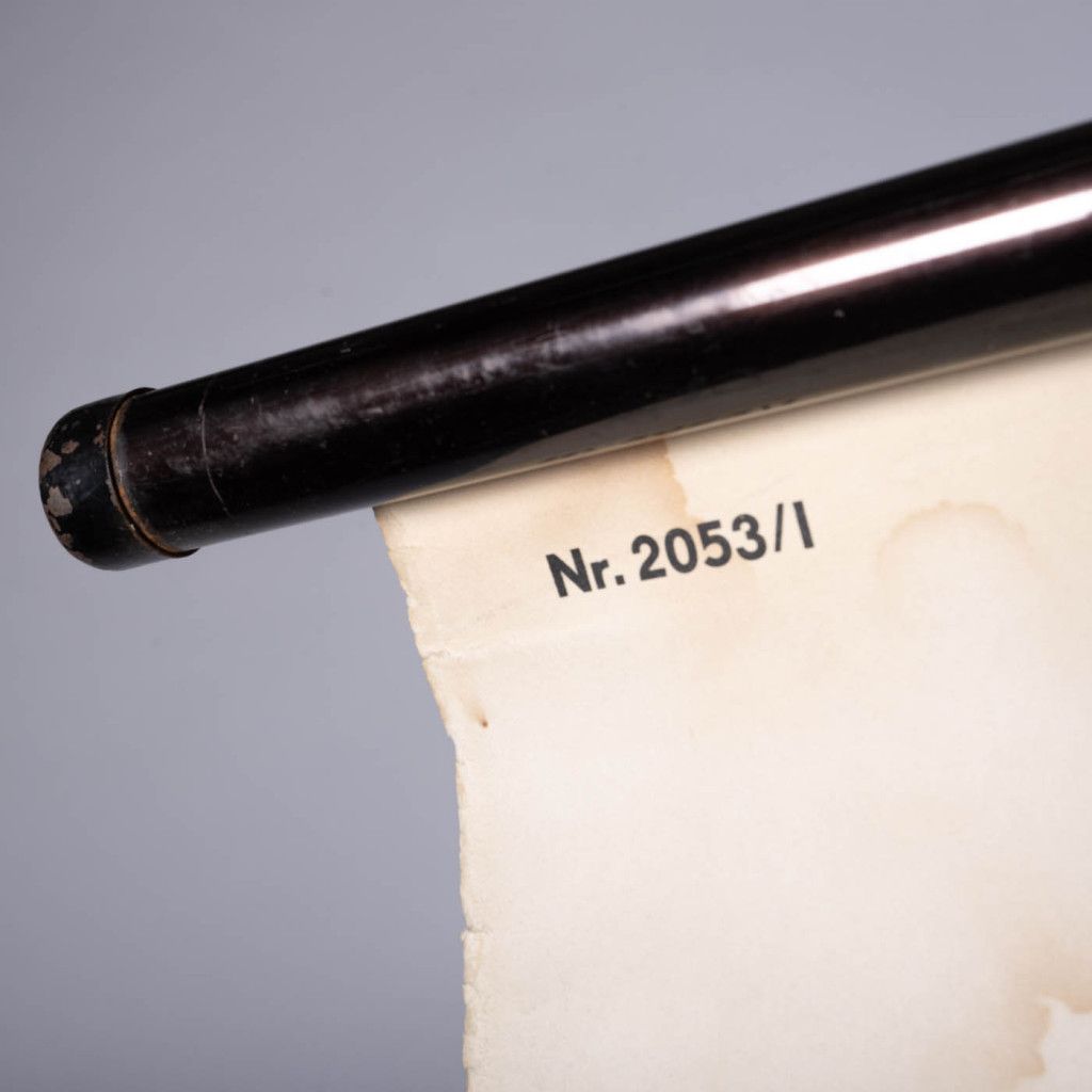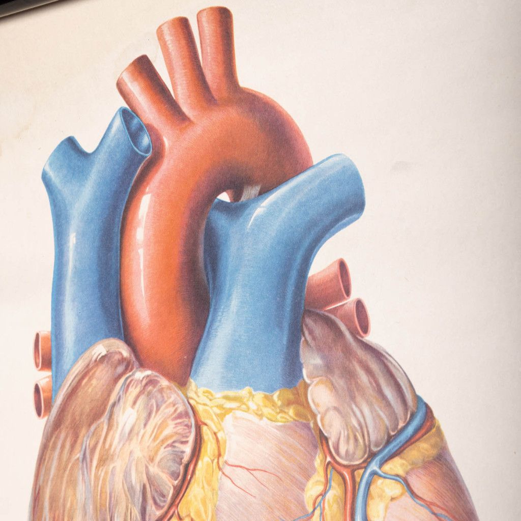 A beautiful old school anatomy poster depicting the human heart. It was most probably made in the 1960s by the German Museum of Hygiene in Dresden. The poster is printed on thick paper backed with canvas and reinforced at the top and bottom by hollow, black-lacquered metal battens. The poster has a fabric loop at the top for hanging. It is in good original condition with visible patina. There are water stains in places, and the edges are slightly creased. The black paint on the metal battens is slightly chipped.
