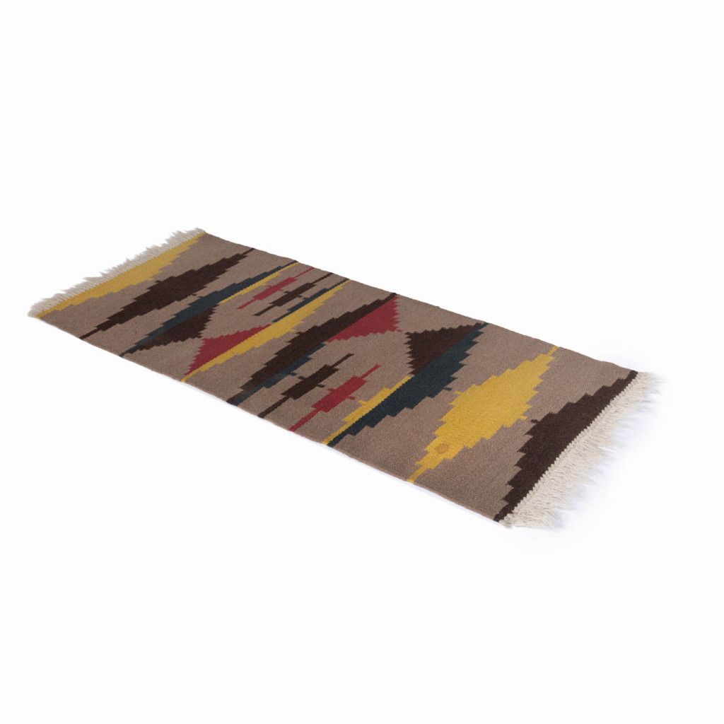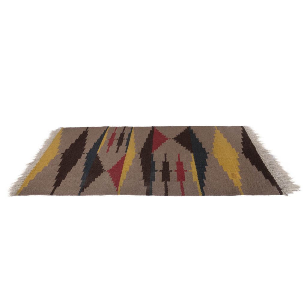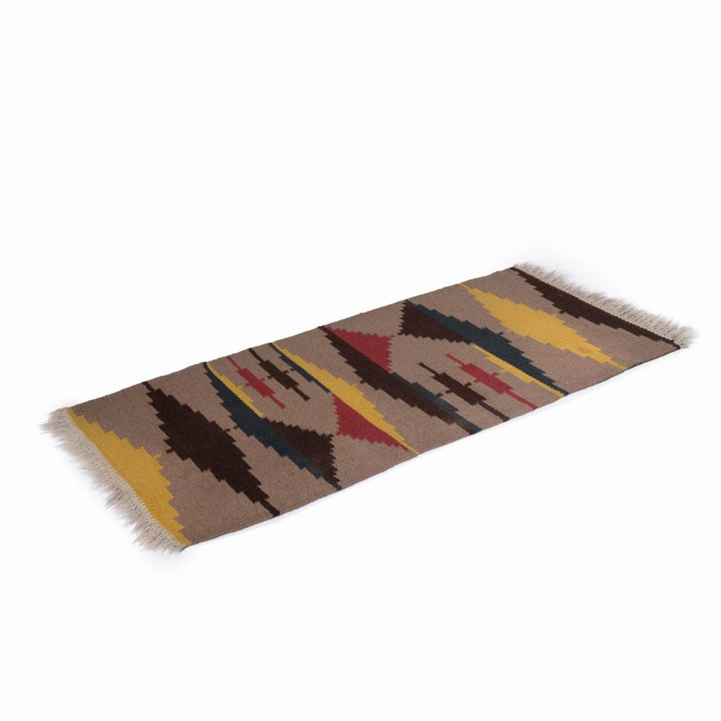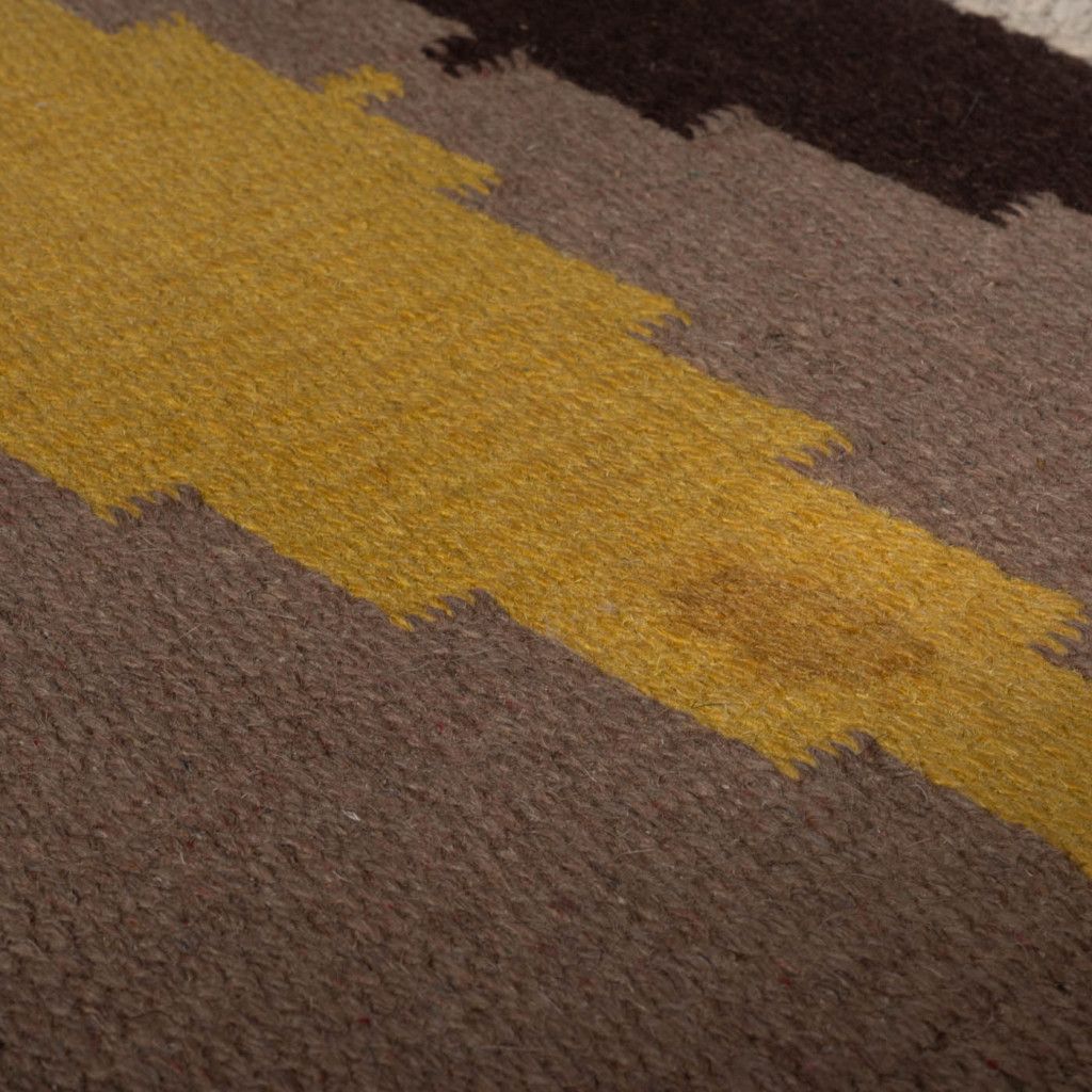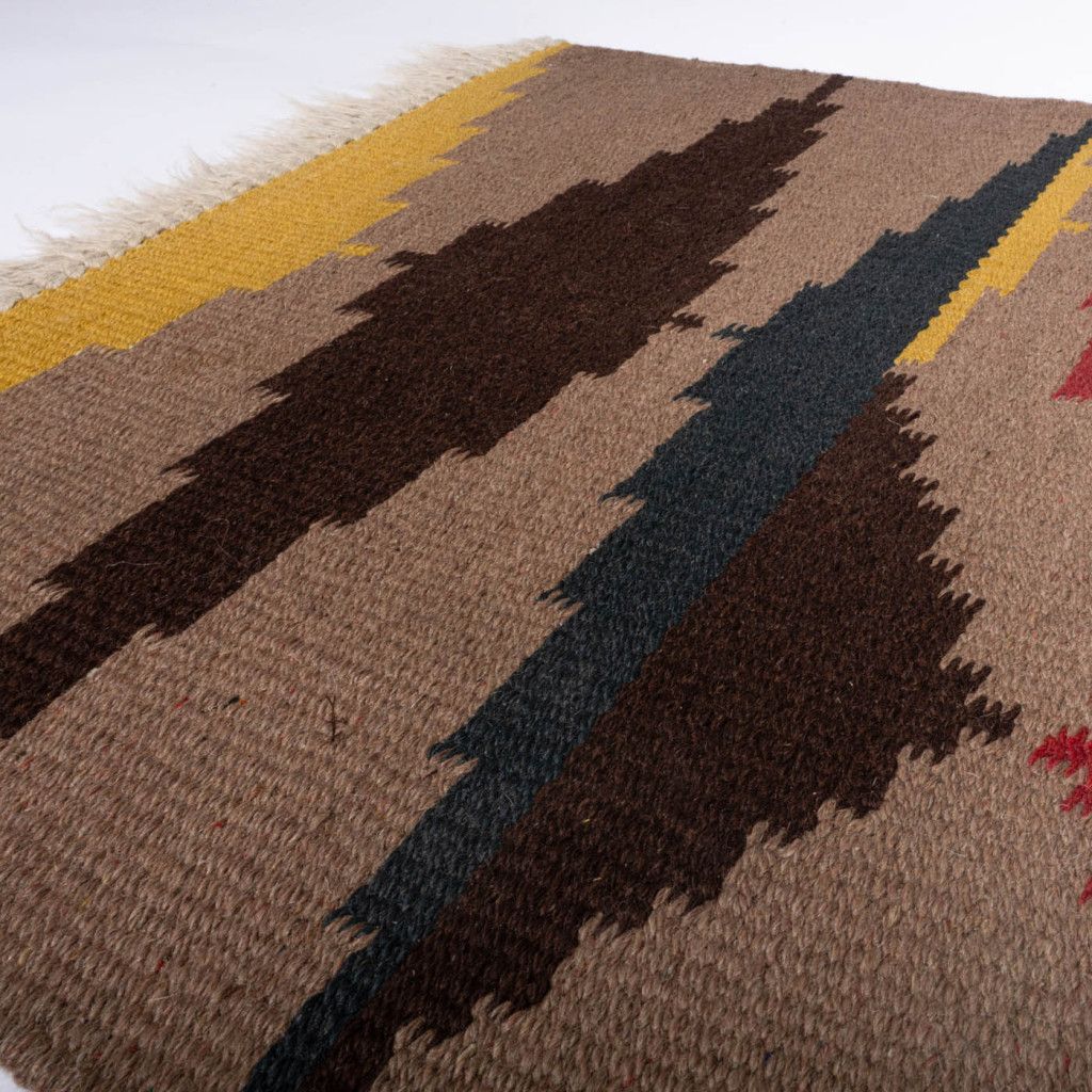 Woven wool Kelim carpet with geometric patterns in earthy tones from the 1960s. Kelim carpets (sometimes also called kilims) are flat-woven carpets that originate from the traditions of nomadic peoples; however, they became very popular in the 20th century and began to be produced industrially as well. The carpet is rectangular in shape and finished with fringes. It is in good original condition. There is a visible stain in one spot, and the fringes do not have full length in some places. The carpet has been thoroughly cleaned, not chemically.