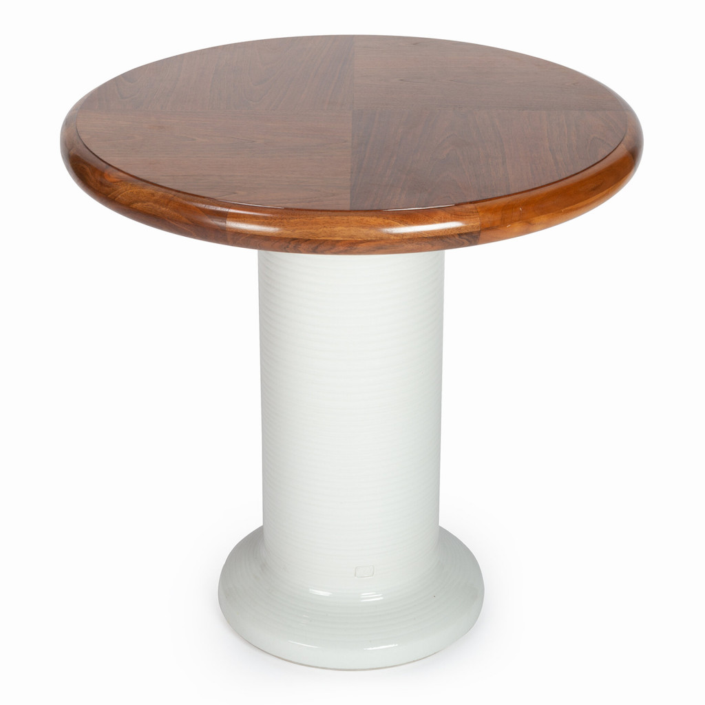 A coffee table from the workshop of ceramicist and sculptor Aleš Werner, who made it as part of a collection in the 1980s. Werner studied in the ceramics and porcelain studio of the Academy of Arts, Architecture & Design in Prague as a student of Otto Eckert. He designs and produces functional ceramics and often creates artworks for architecture. The table has a solid leg made of white glazed ceramic, and the top is made of solid wood with a veneered surface. The coffee table has undergone a complete renovation, and it is in excellent condition with no damage. The piece has been signed by the artist with a stamp at the bottom.