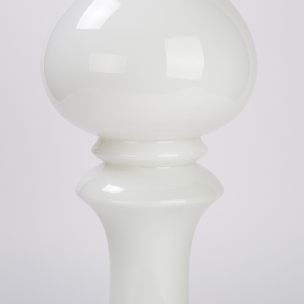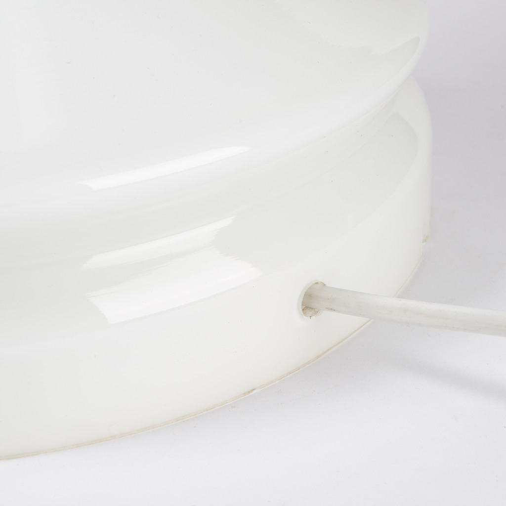 A glass lamp called Bishop designed by a Czech artist and designer Ivan Jakeš. Ivan Jakeš worked many years for a national enterprise Lighting factory (in Czech called Osvětlovací sklo) in Valašské Meziříčí. He produced tens of designs working for this company, but his chess pieces designed in 1970 are probably his most famous works. While the white being the classic colour for them, they were produced in many bright colours and were exported abroad. The Bishop lamp is made of three layers of white opaque glass, when lit the upper part glows with pleasantly warm light. The lamp is fully functional, in a good original condition.