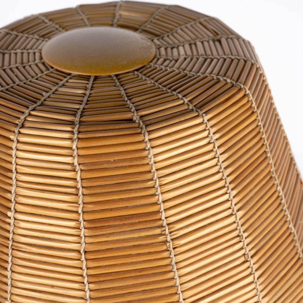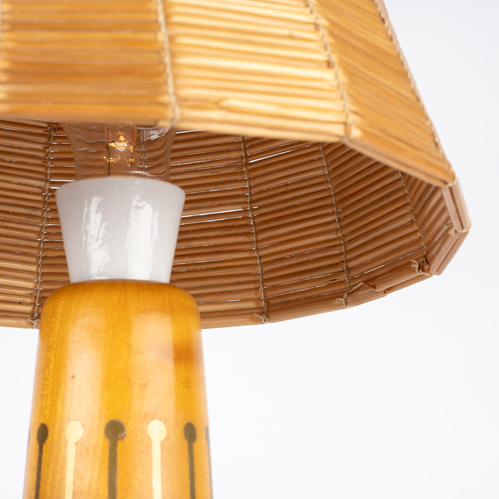 The lampshade is made of dried straw and the solid maple leg is decorated with a brass pattern.