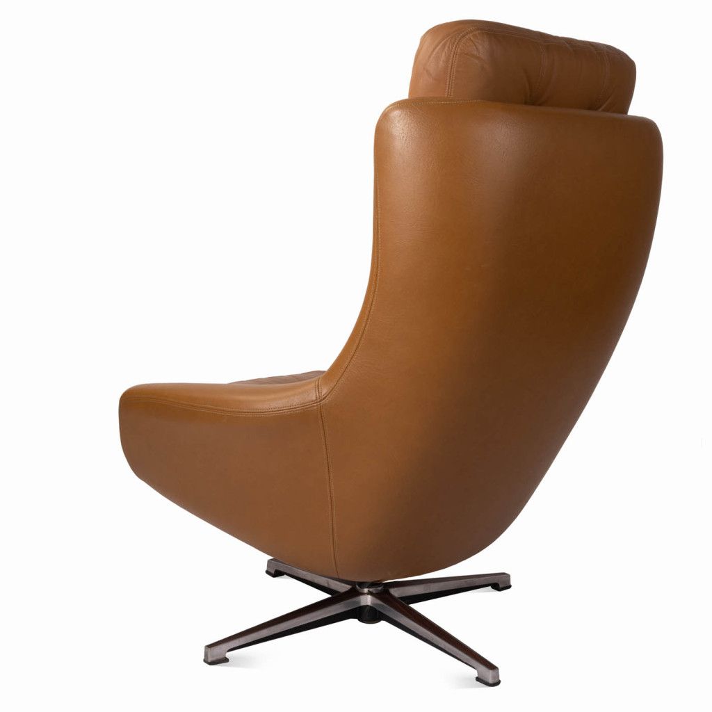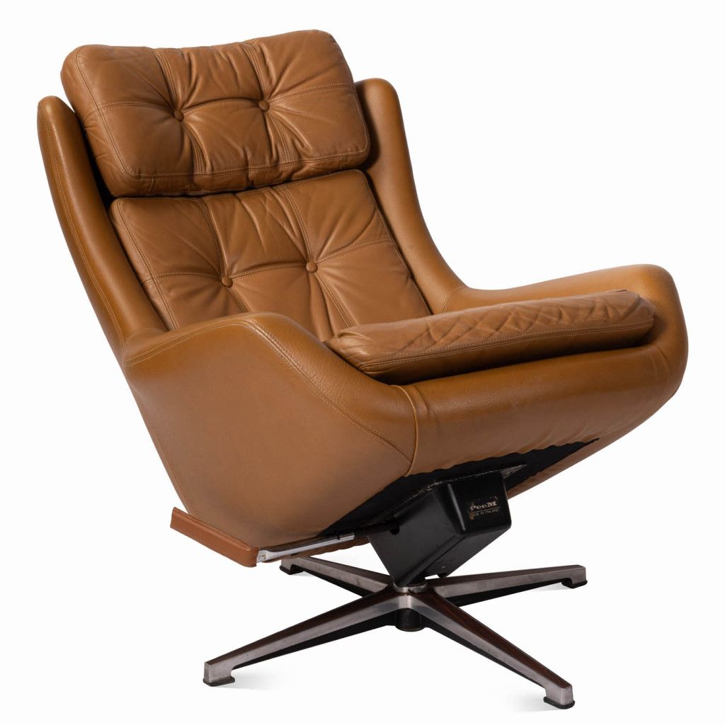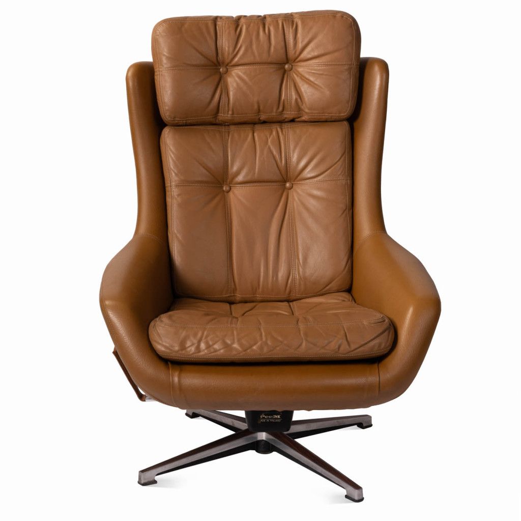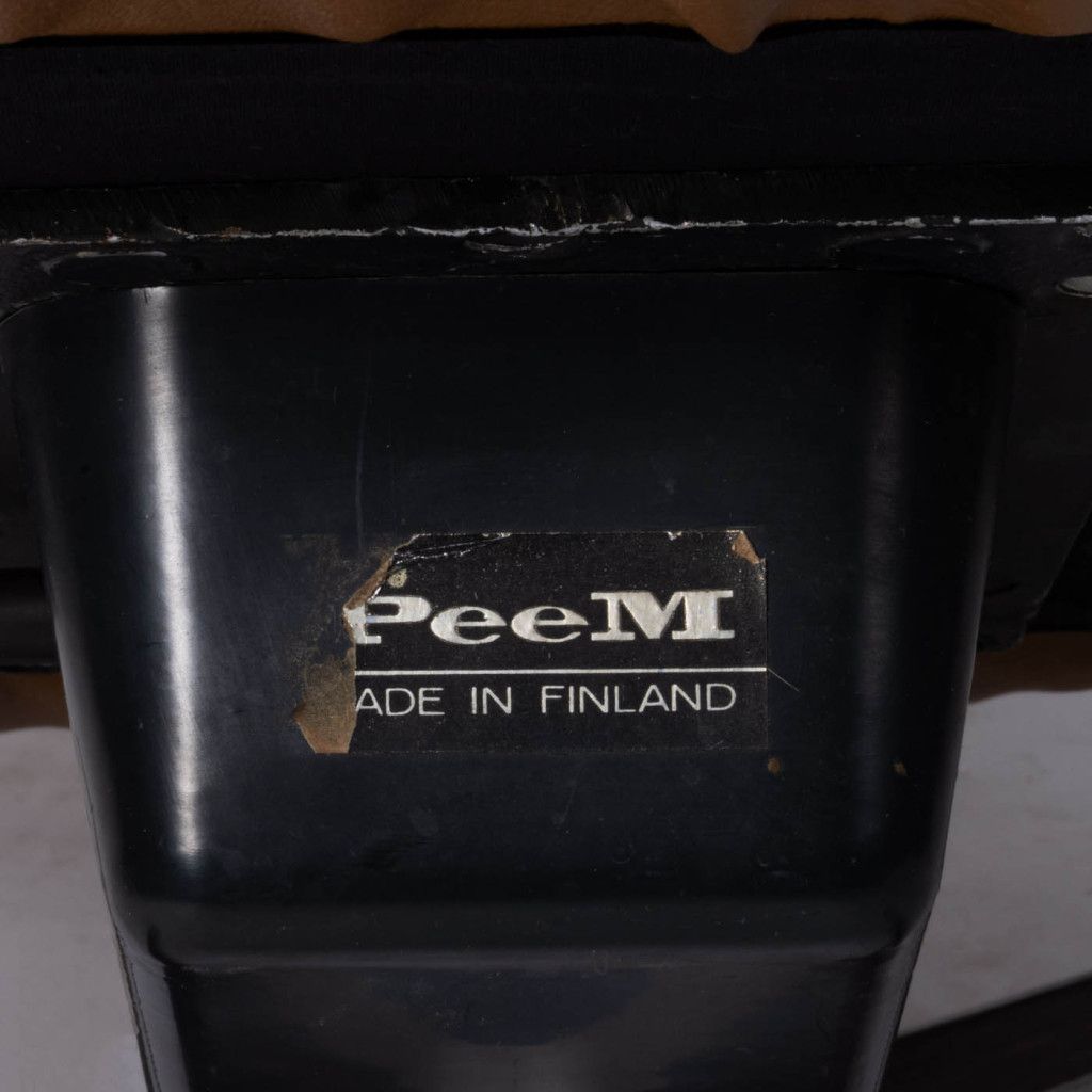 Leather armchair produced by the Finnish company PeeM in the 1970s for the Czechoslovak market, and distributed exclusively through the Tuzex retail chain. It was considered a luxury item at the time, which is why these armchairs are often found in excellent condition today. The armchair has a leatherette frame and three soft, quilted, buttoned cushions upholstered in ochre-coloured genuine leather. The aluminium steel base allows the chair to swivel and recline.