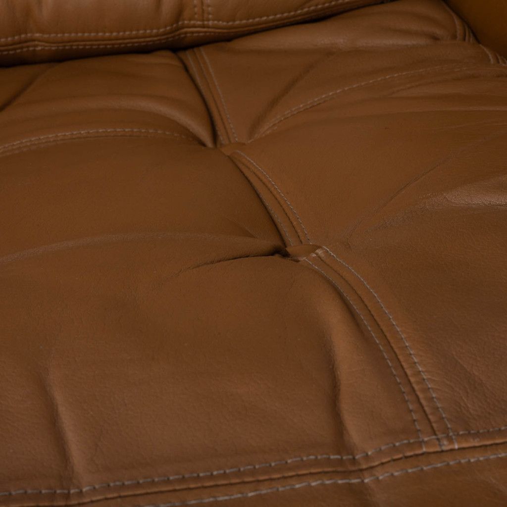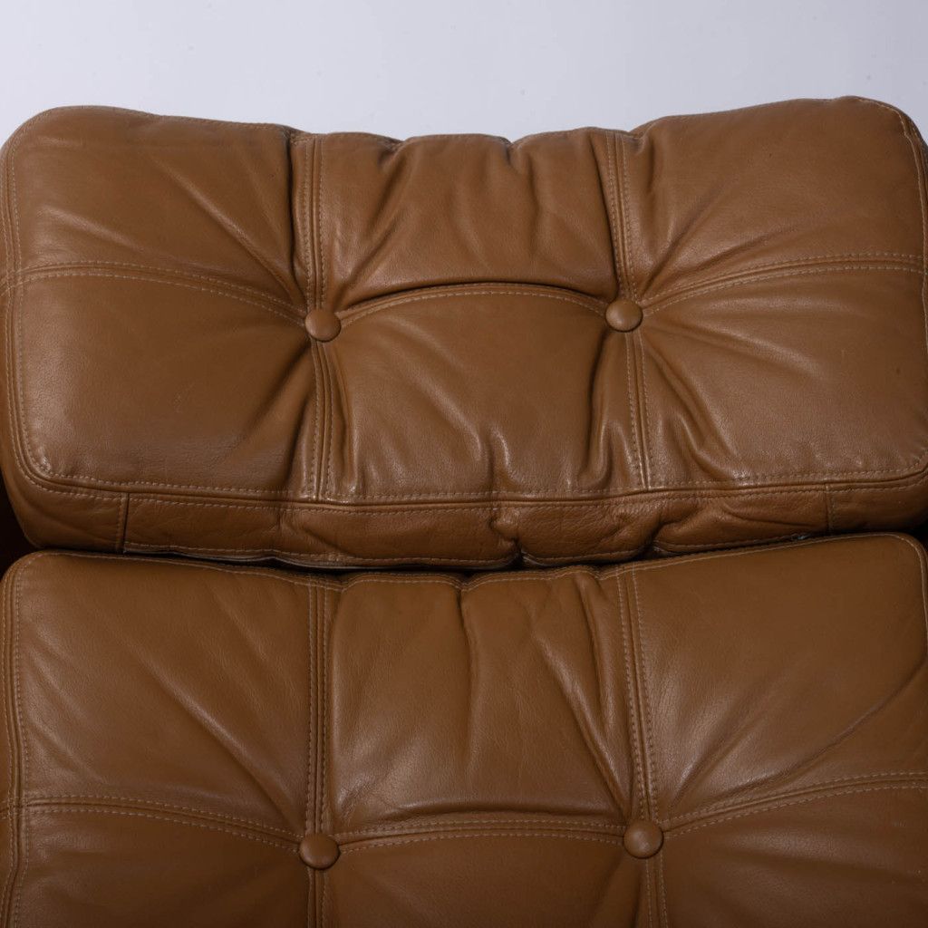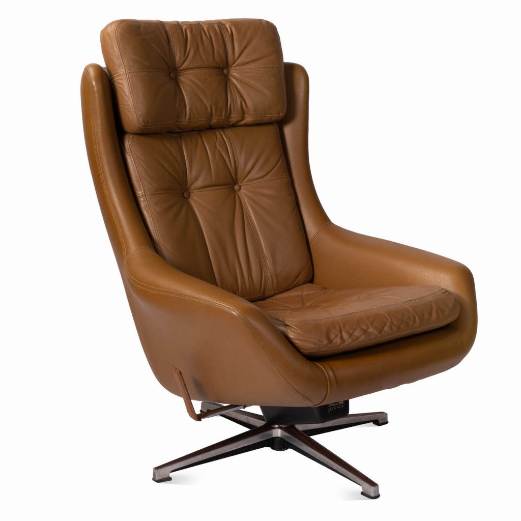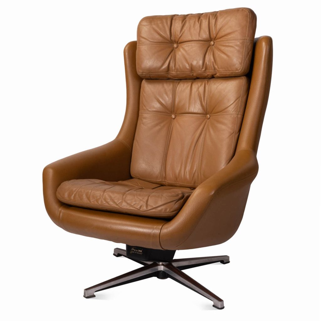 Leather armchair produced by the Finnish company PeeM in the 1970s for the Czechoslovak market, and distributed exclusively through the Tuzex retail chain. It was considered a luxury item at the time, which is why these armchairs are often found in excellent condition today. The armchair has a leatherette frame and three soft, quilted, buttoned cushions upholstered in ochre-coloured genuine leather. The aluminium steel base allows the chair to swivel and recline.