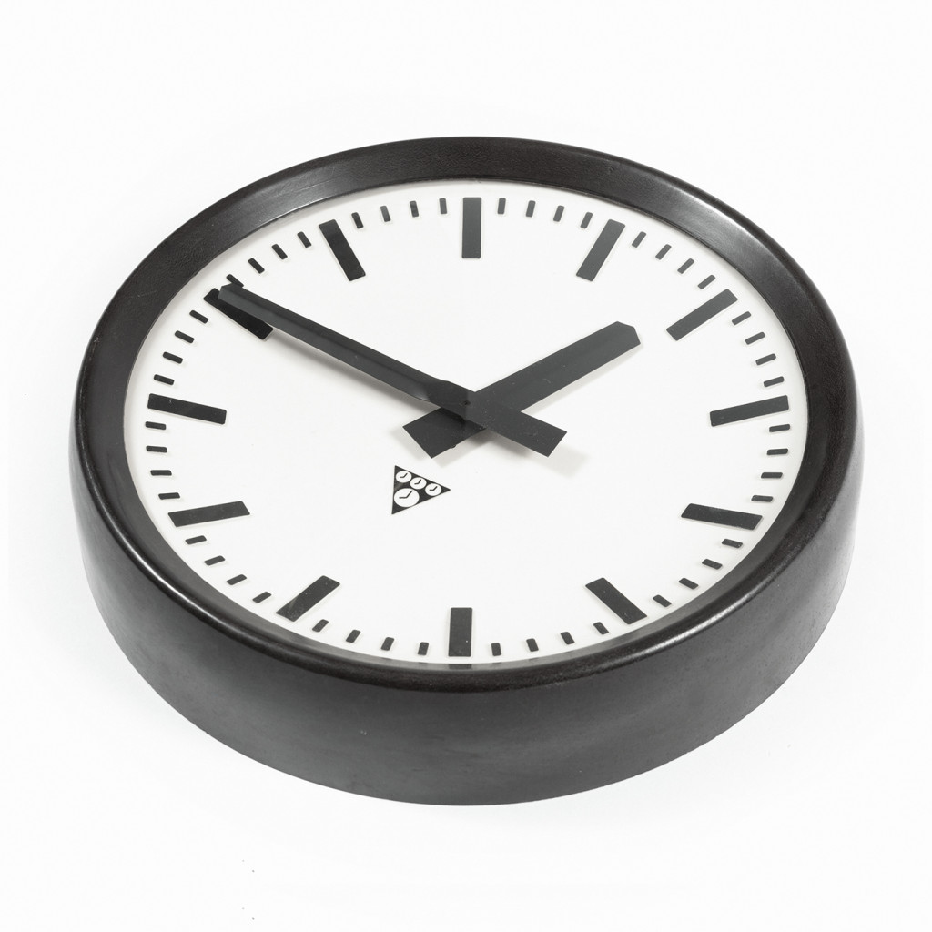 A black and white clock notoriously known from Czech (and Czechoslovak) public spaces, as it was and still is placed at stations, schools and all kinds of public buildings. It is an exterior model with contrasting clock dial and thick hands, so it is visible from great distance. Otherwise the dial is very simple designed, the number on the classic dials were abstracted to bold five minutes marks and the only other thing on the dial is the typical triangular logo of the brand. On our website we offer more types of these clocks in smaller sizes and with a brown frame.