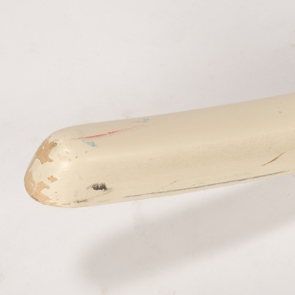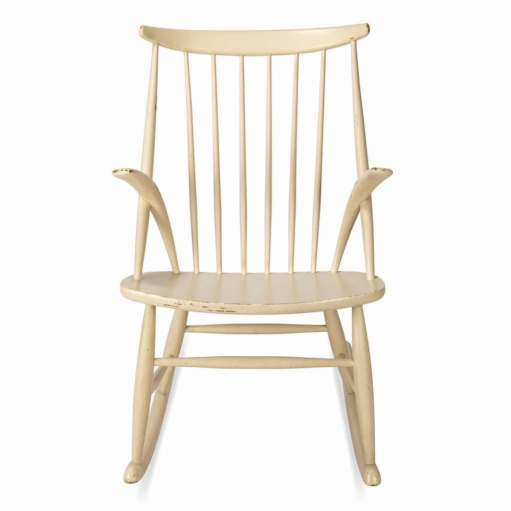 Rocking chair made in Finland in the 1960s. The chair was designed by Lena Larsson and Ilmara Tapiovaara. Its construction is made of wood and finished with a white paint that peels in places. These rocking chairs can still be found in many homes and are a desirable product for anyone looking for a quality and stylish piece of furniture.