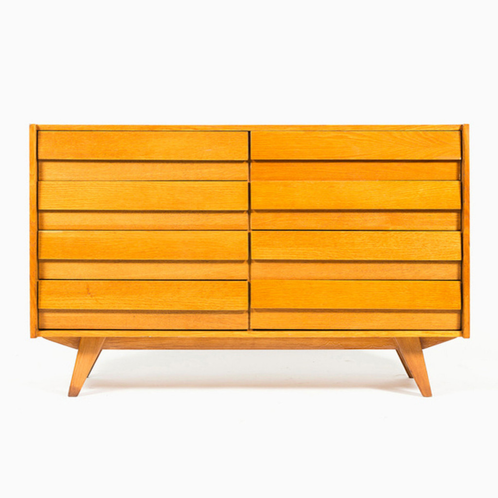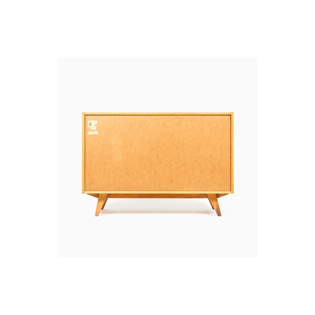 The chest of drawers is part of the famous Universal series (U-450) designed in 1958 by Jiří Jiroutek for the Czechoslovak national company Interiér Praha.