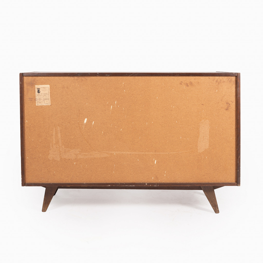 The chest of drawers is part of the famous Universal series (U-450) designed in 1958 by Jiří Jiroutek for the Czechoslovak national company Interiér Praha.