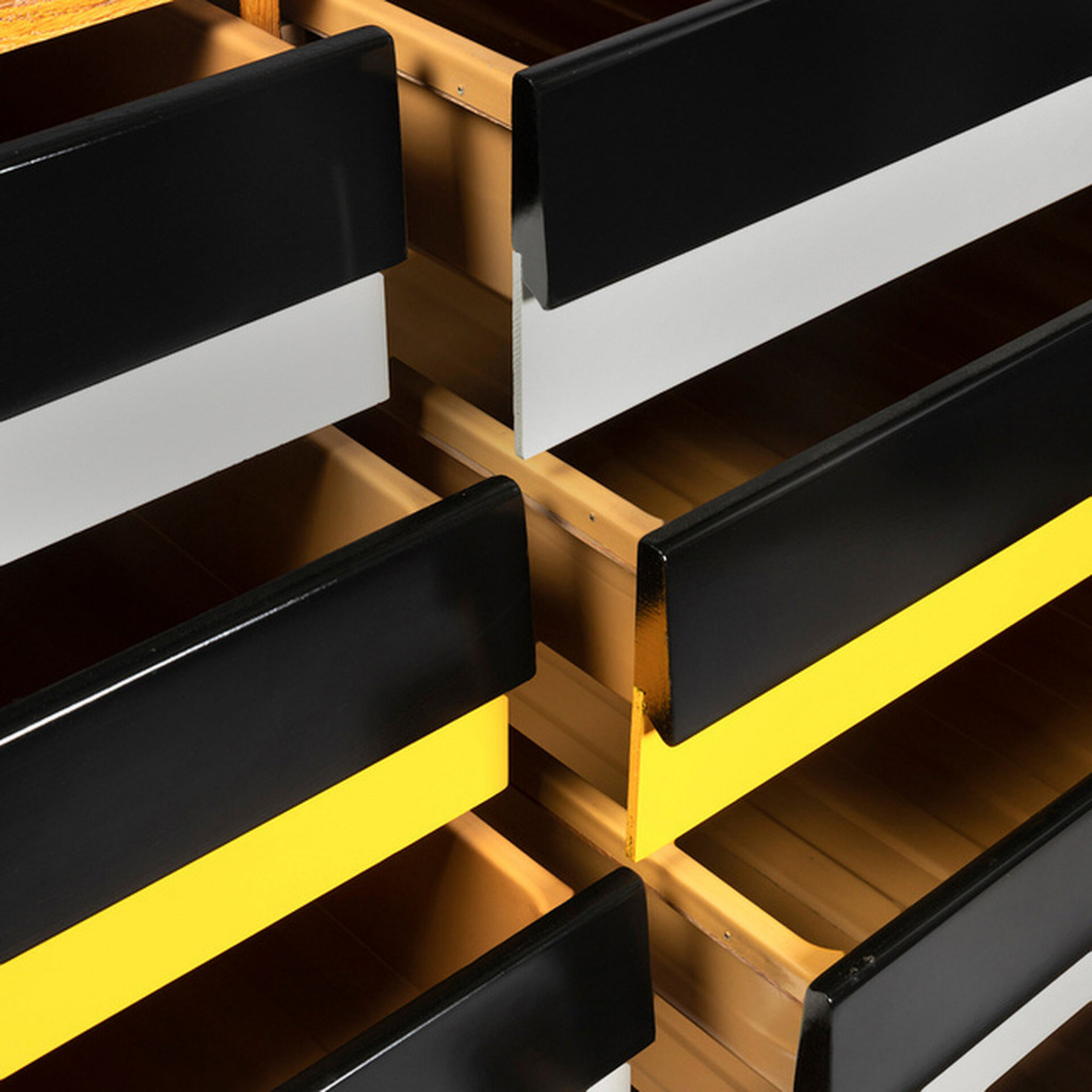 The U-453 cabinet is suitable for any room, it is compact and relatively light, so it is easy to handle. The cabinet has eight drawers in grey and yellow with black handles and a veneered (oak) finish. The base is solid spruce. We have consulted Jiří Jiroutek, from whom we also have the exclusive right to renew the production of the entire U-450 series since 2018.
